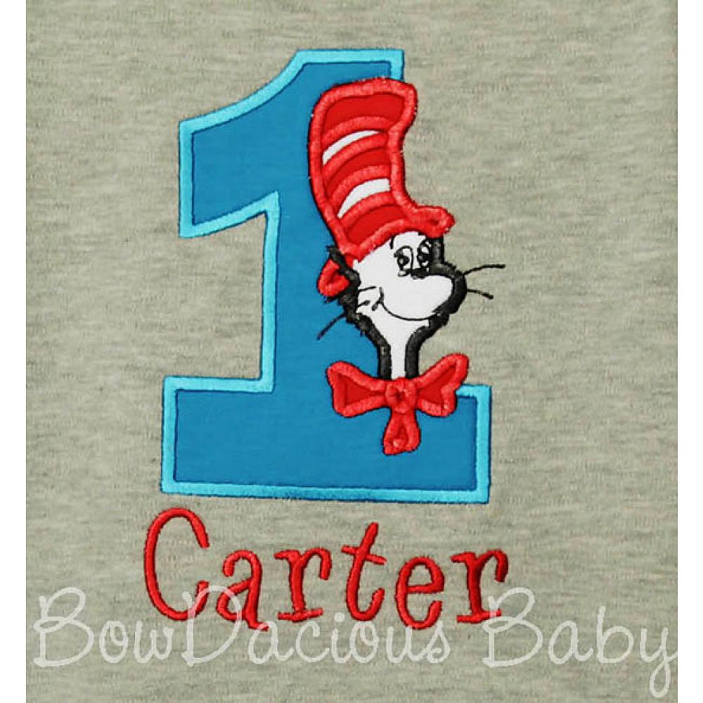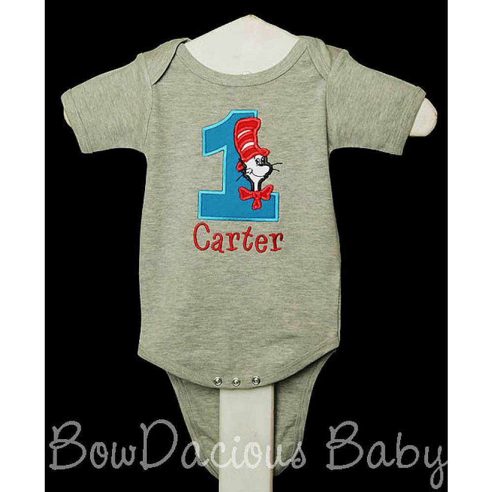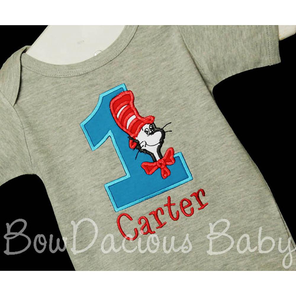Custom Cat in the Hat birthday number shirt or onesie. Custom made to your specifications. You pick the fabric, font, and thread colors. Any Age. Add shorts, pants, a coordinating bib or diaper cover to complete the outfit.