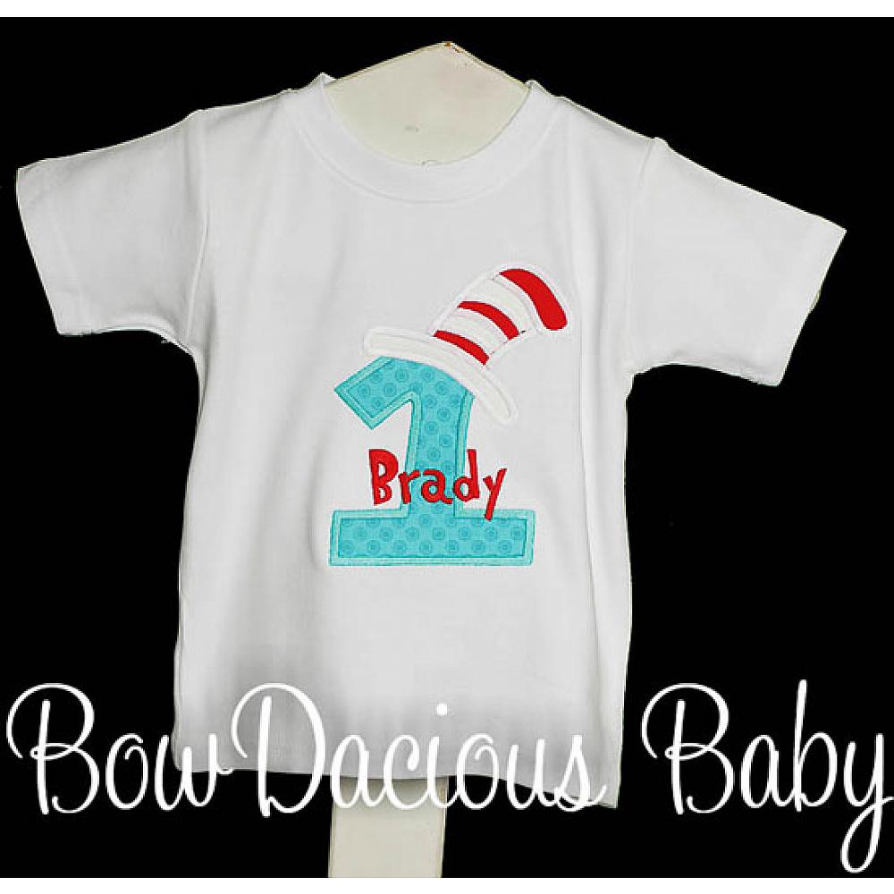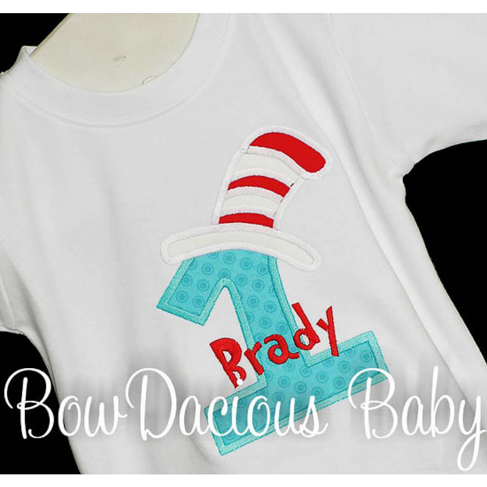 Custom Cat in the Hat birthday number shirt or onesie. Custom made to your specifications. You pick the fabric, font, and thread colors. Any Age. Add shorts, pants, a coordinating bib or diaper cover to complete the outfit.