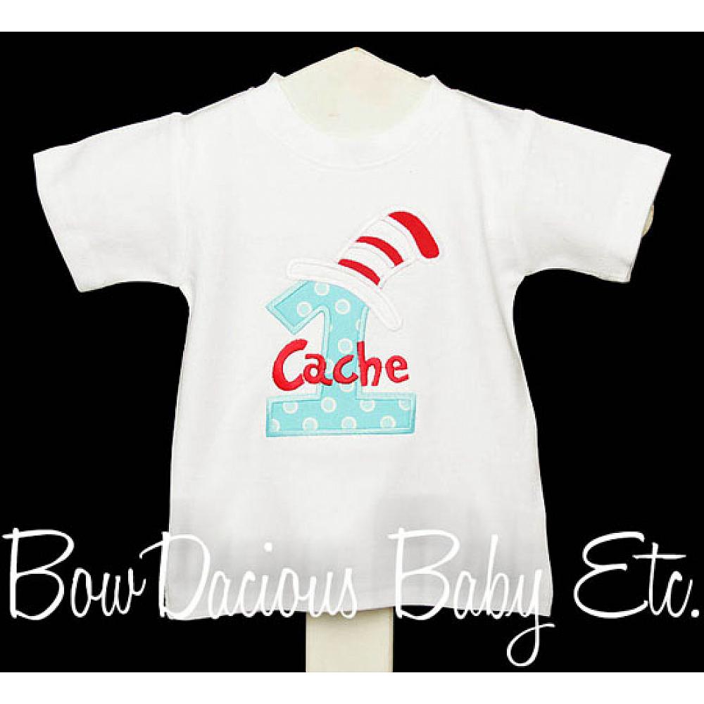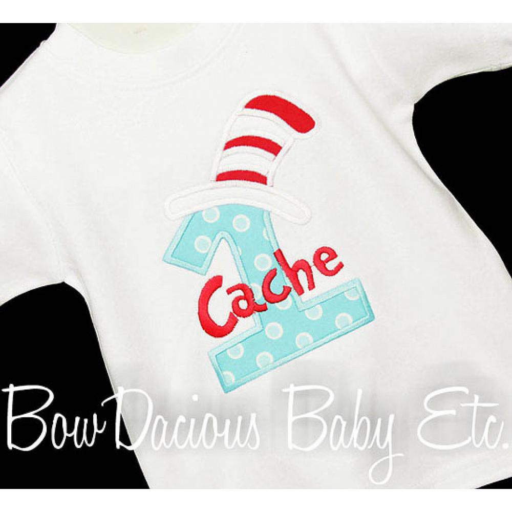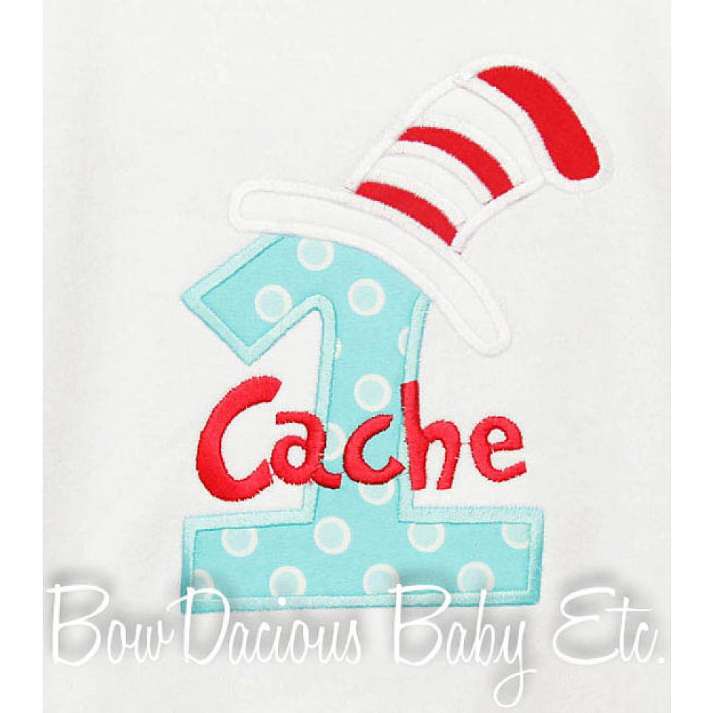 Custom Cat in the Hat birthday number shirt or onesie. Custom made to your specifications. You pick the fabric, font, and thread colors. Any Age. Add shorts, pants, a coordinating bib or diaper cover to complete the outfit.