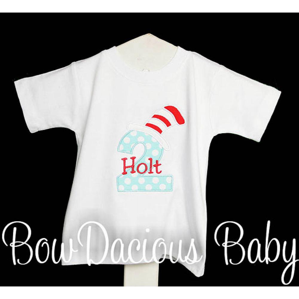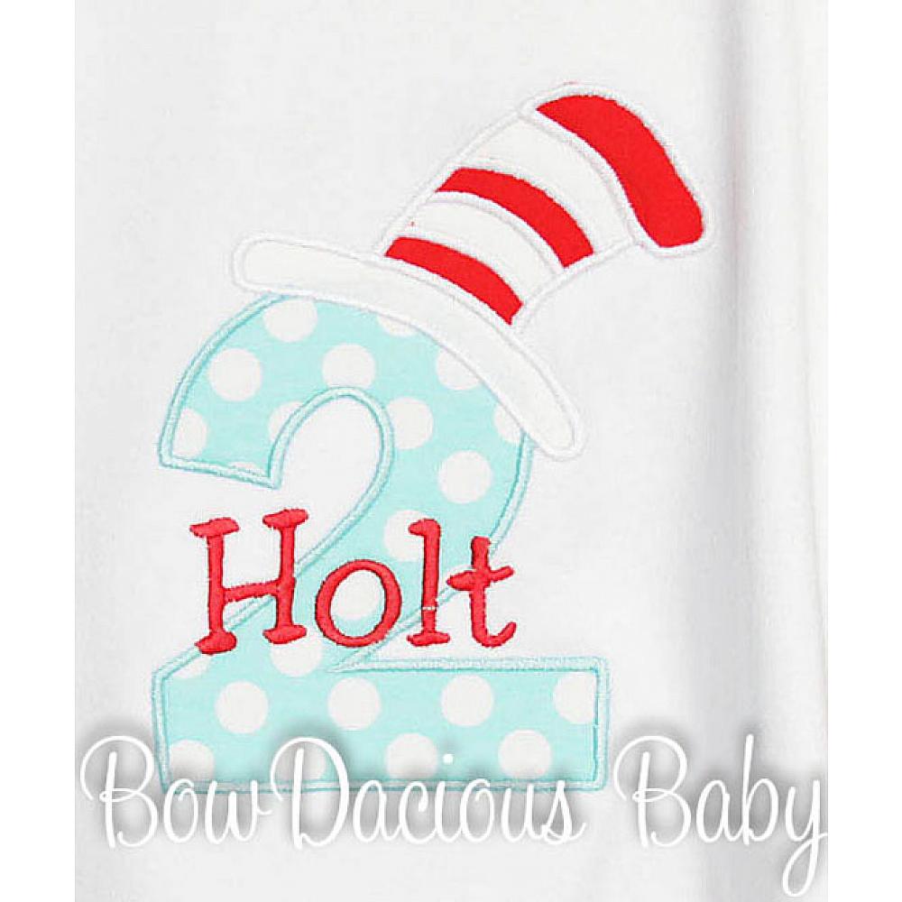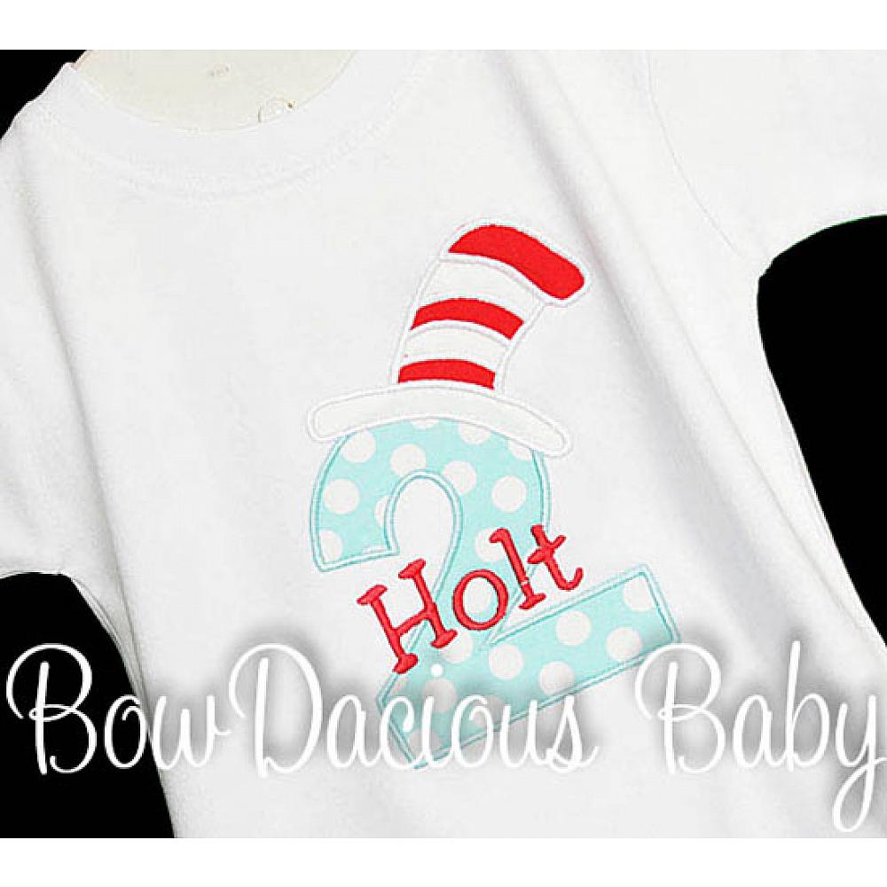 Custom Cat in the Hat birthday number shirt or onesie. Custom made to your specifications. You pick the fabric, font, and thread colors. Any Age. Add shorts, pants, a coordinating bib or diaper cover to complete the outfit.
