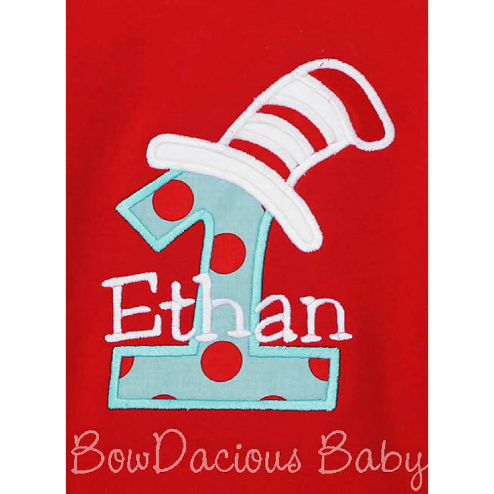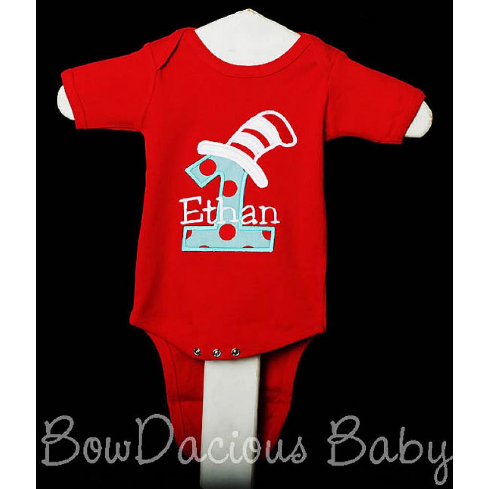 Custom Cat in the Hat birthday number shirt or onesie. Custom made to your specifications. You pick the fabric, font, and thread colors. Any Age. Add shorts, pants, a coordinating bib or diaper cover to complete the outfit.