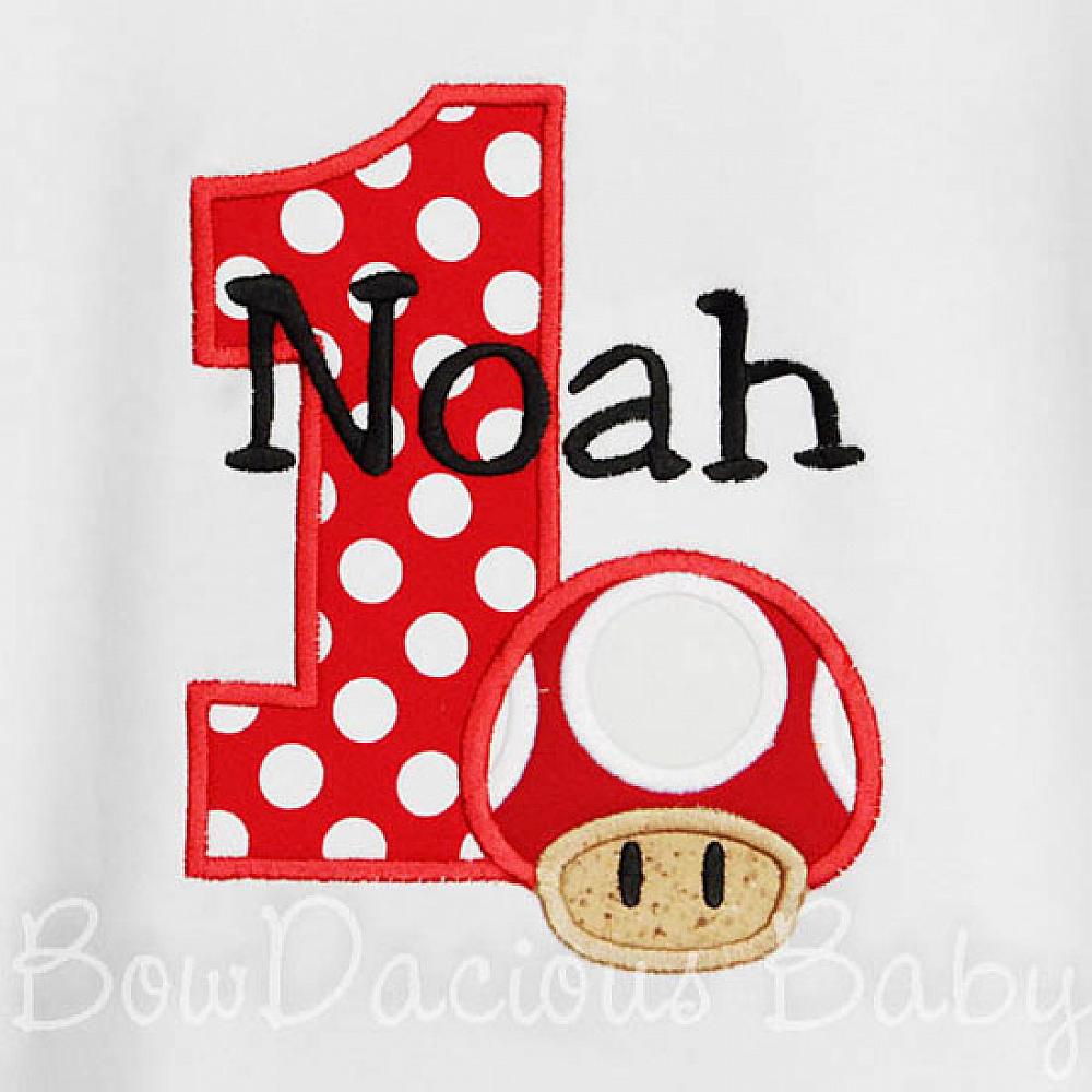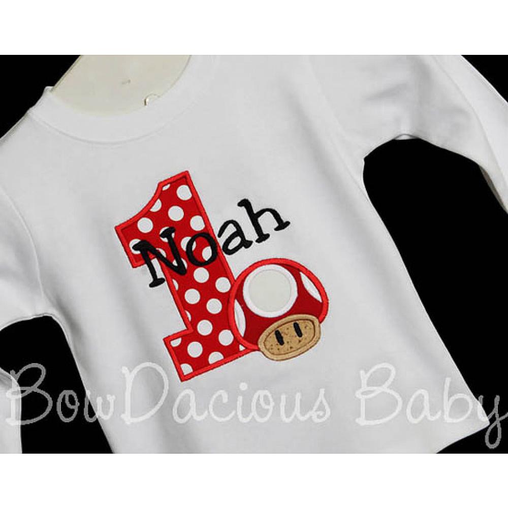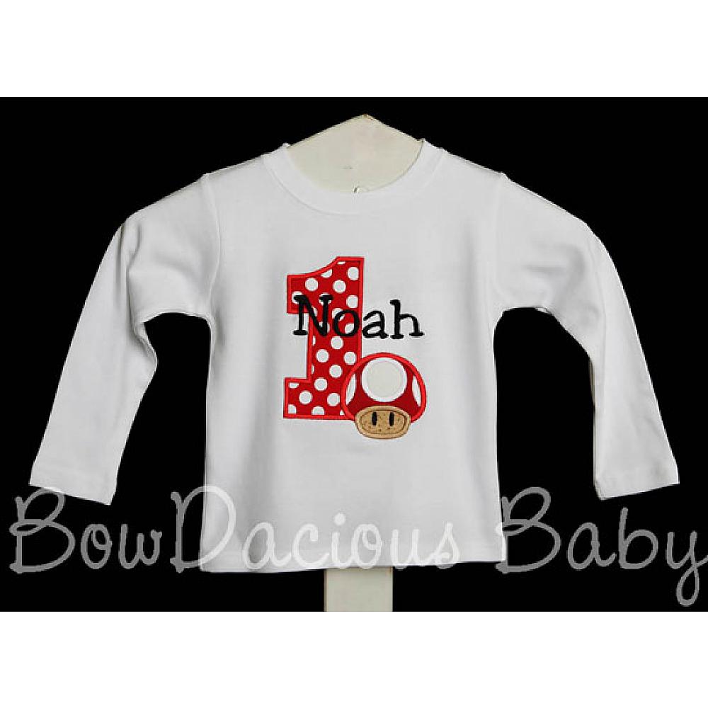 Personalized Mario Brothers Mushroom birthday shirt or onesie. Custom made to your specifications. You pick the fabric, font, and thread colors. Any Age. Add shorts, pants, a coordinating bib or diaper cover to complete the outfit.