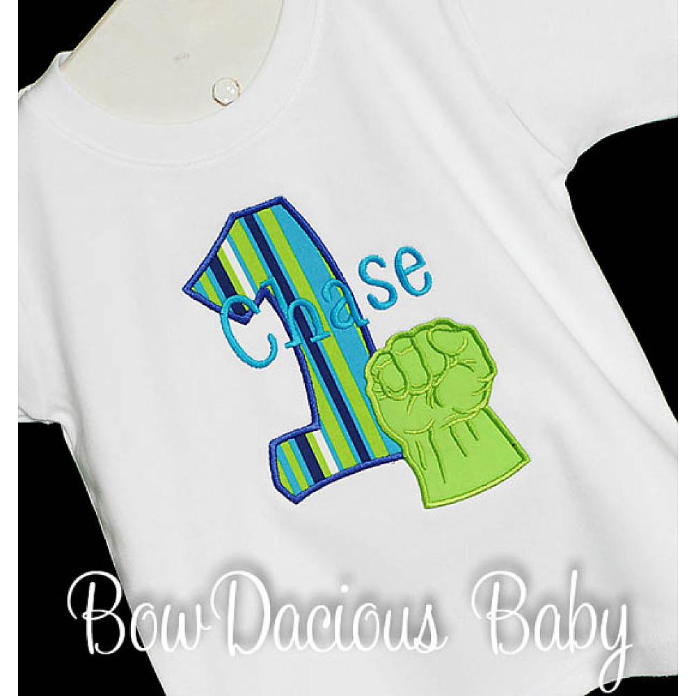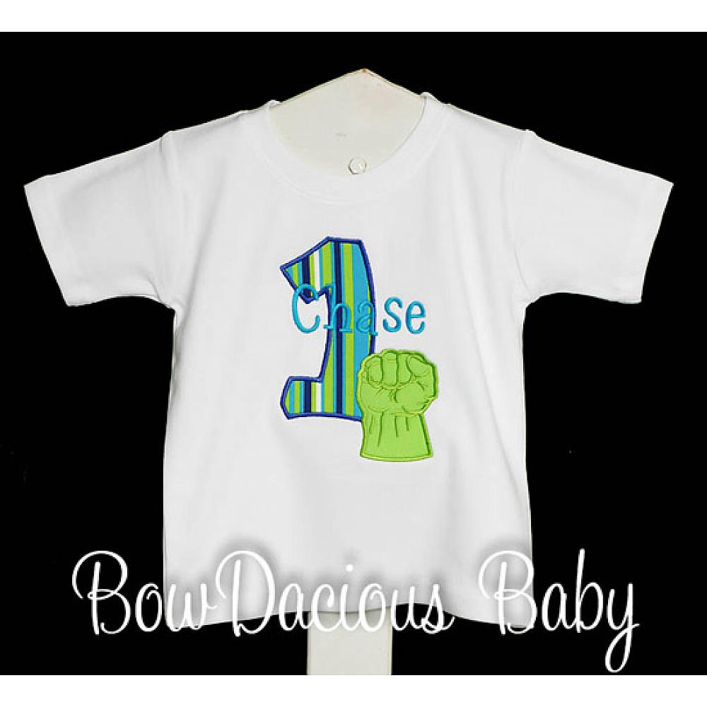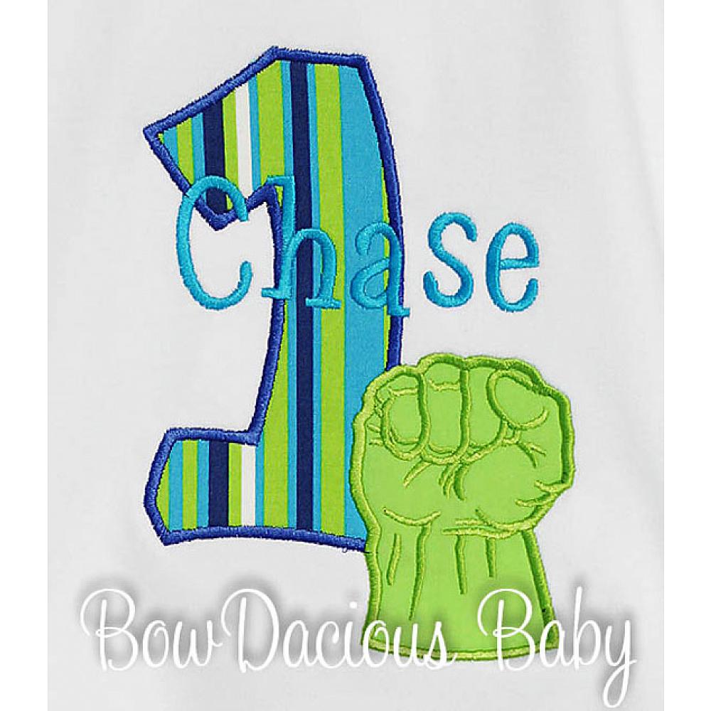 Hulk birthday shirt or onesie. Custom made to your specifications. You pick the fabric, font, and thread colors. Any Age. Add shorts, pants, a coordinating bib or diaper cover to complete the outfit.