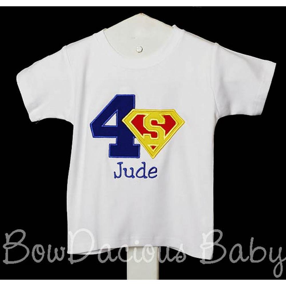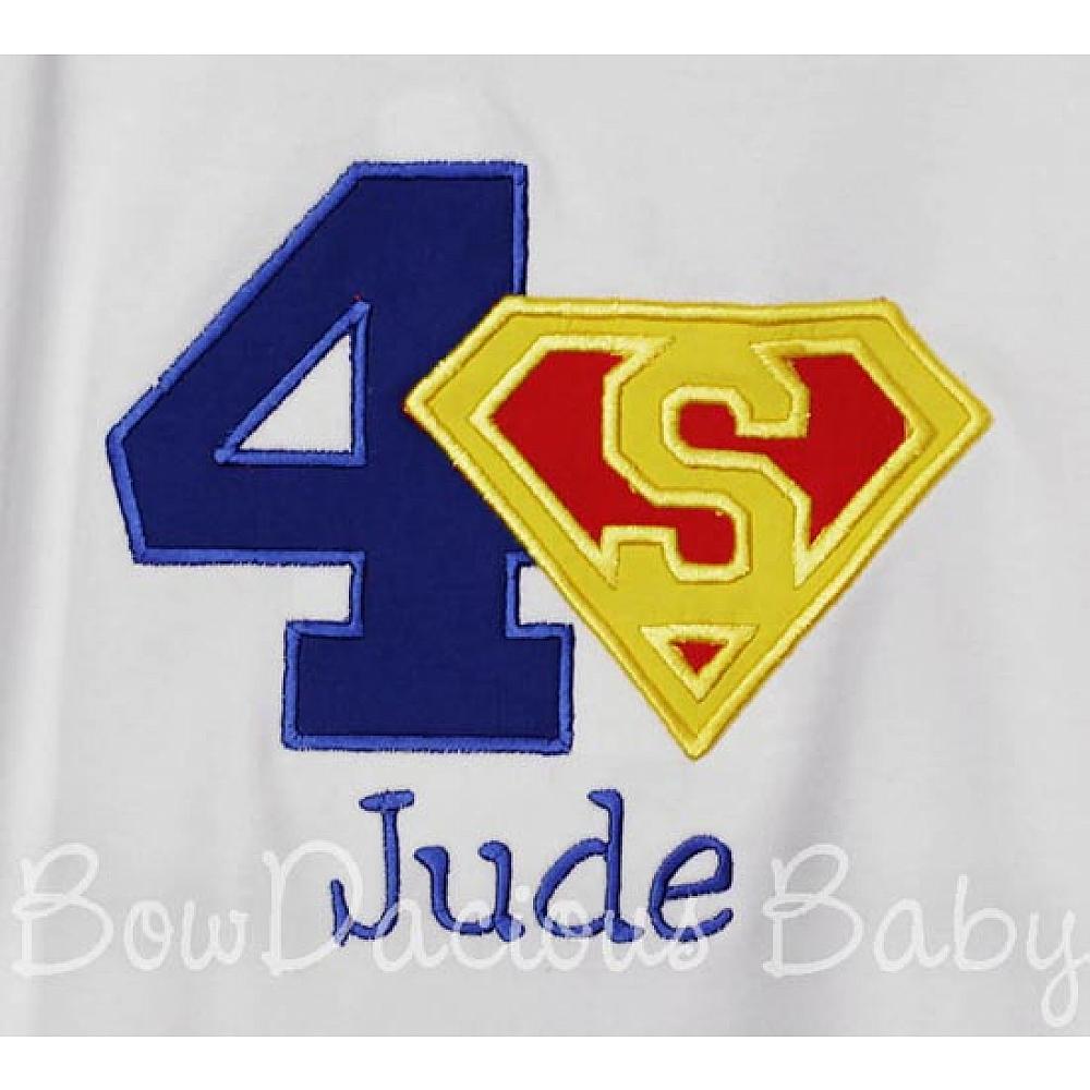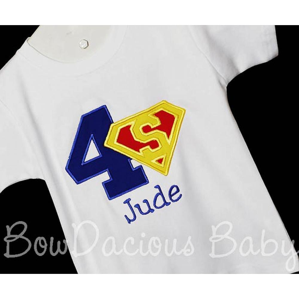 Superman birthday shirt or onesie. Custom made to your specifications. You pick the fabric, font, and thread colors. Any Age. Add shorts, pants, a coordinating bib or diaper cover to complete the outfit.