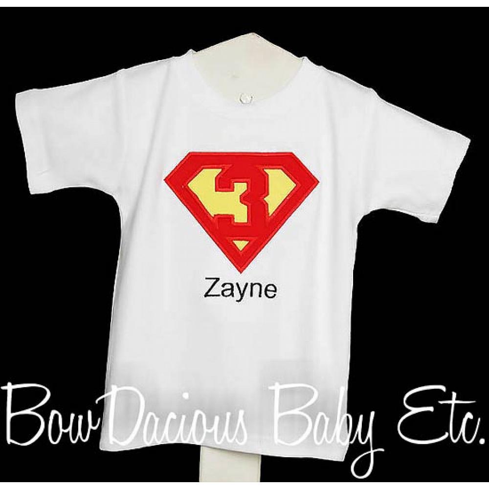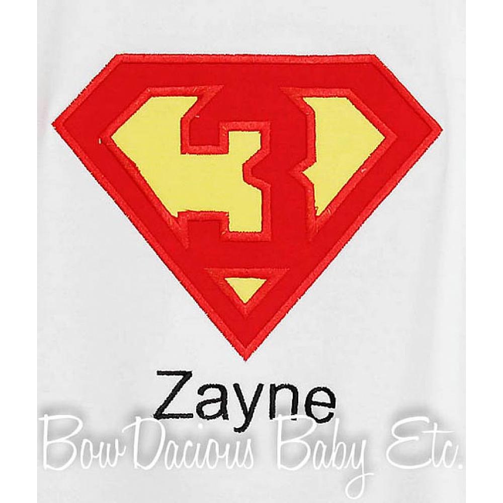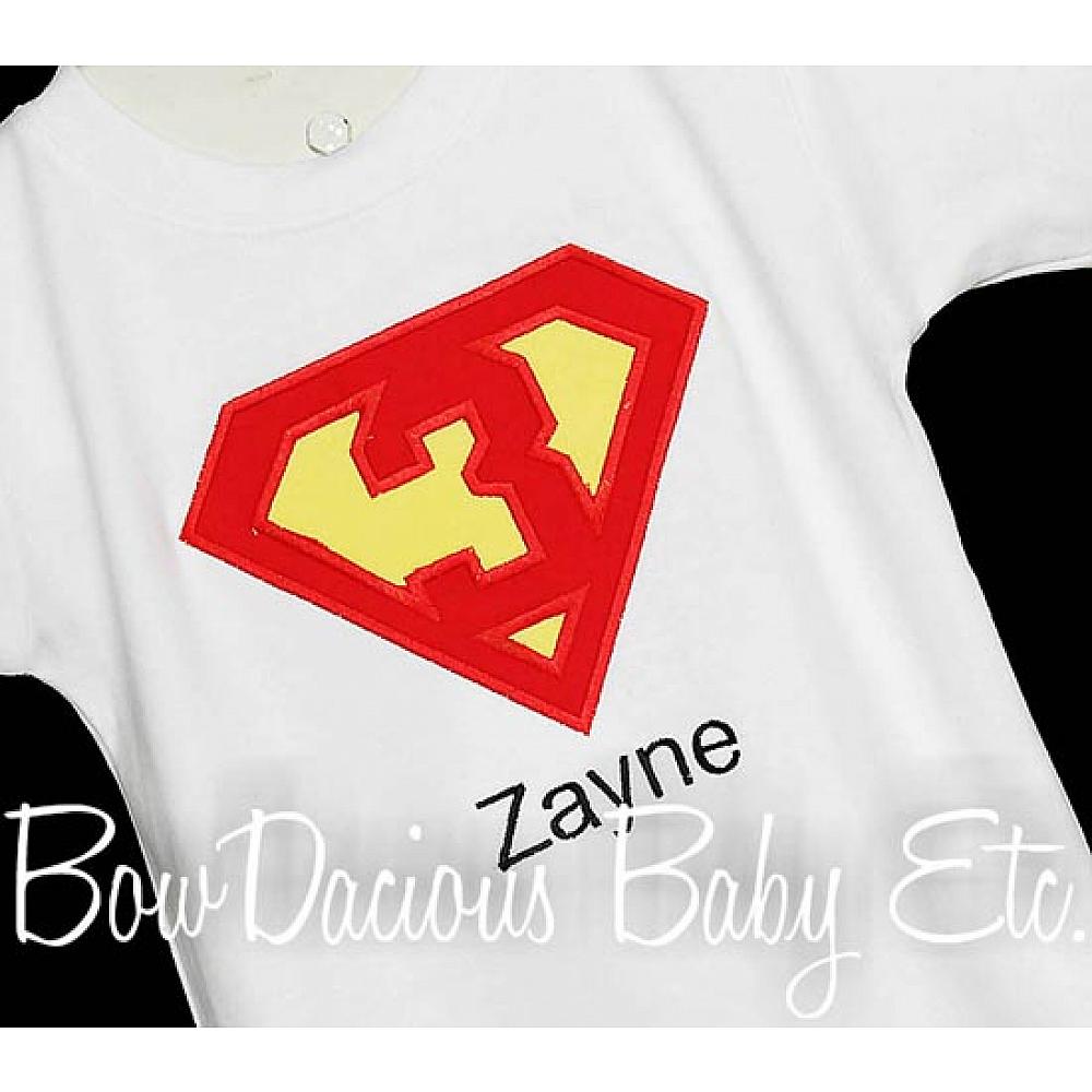 Superman birthday shirt or onesie. Custom made to your specifications. You pick the fabric, font, and thread colors. Any Age. Add shorts, pants, a coordinating bib or diaper cover to complete the outfit.