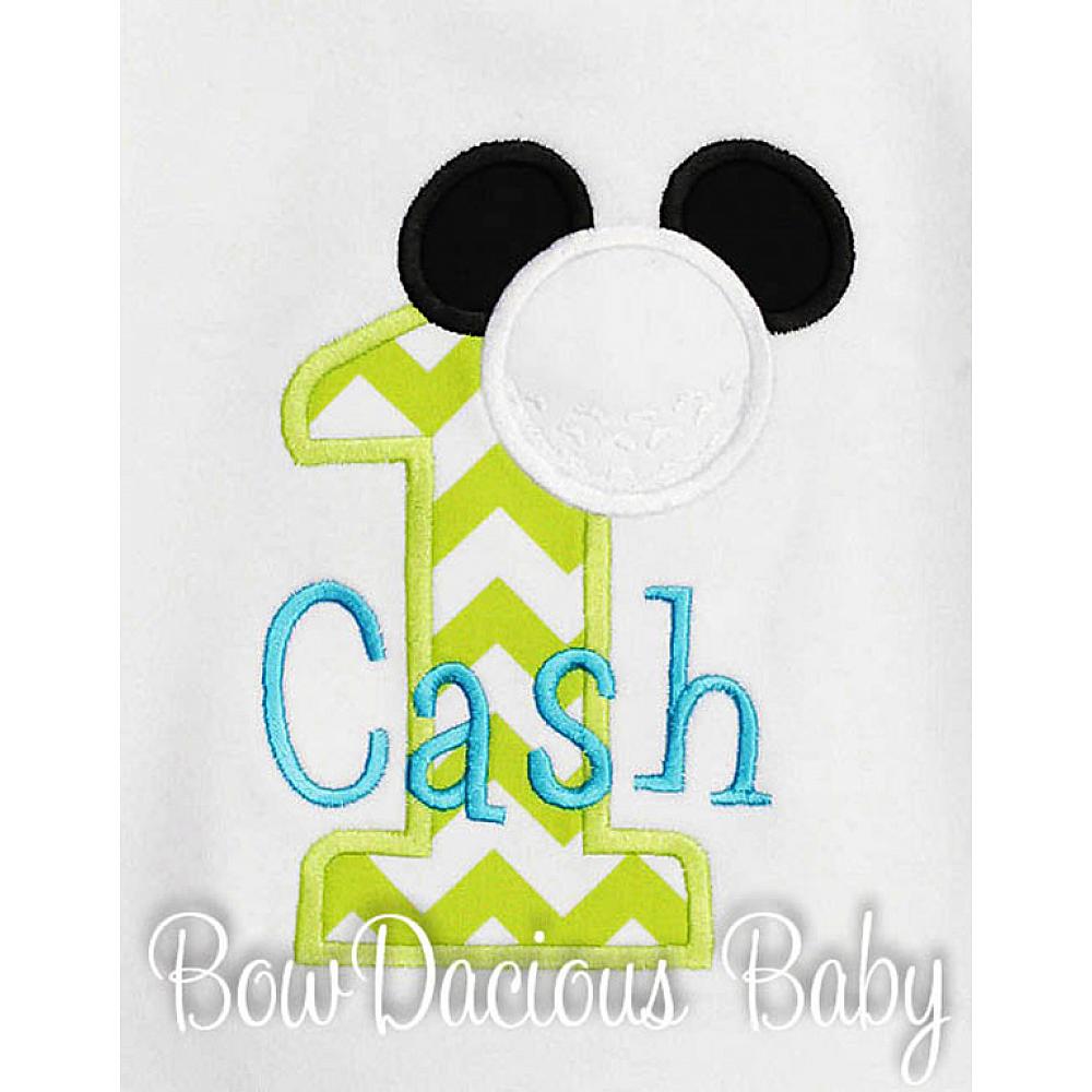 Personalized golf Mickey Mouse birthday shirt or onesie. Custom made to your specifications. You pick the fabric, font, and thread colors. Any Age. Add shorts, pants, a coordinating bib or diaper cover to complete the outfit.