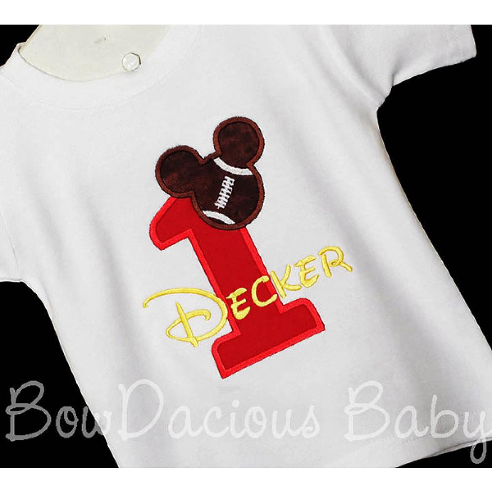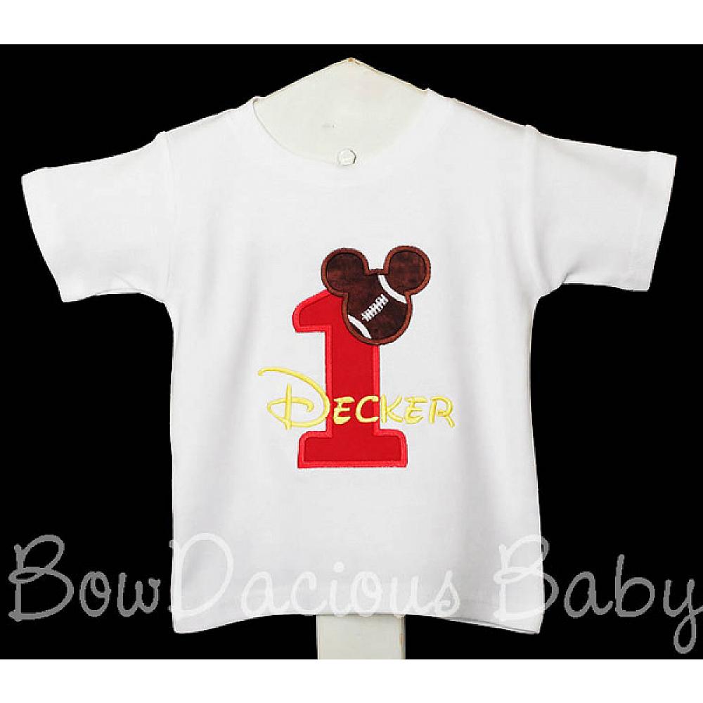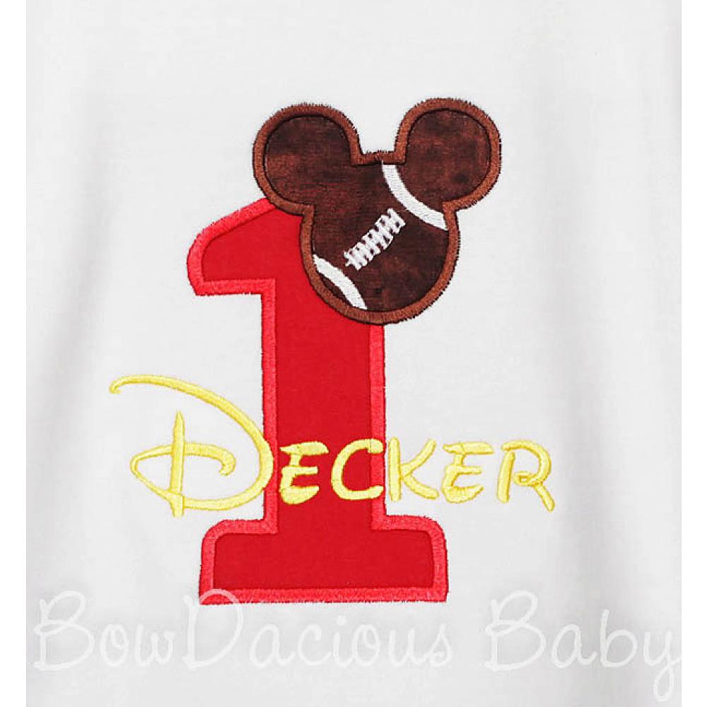 Personalized football Mickey Mouse birthday shirt or onesie. Custom made to your specifications. You pick the fabric, font, and thread colors. Any Age. Add shorts, pants, a coordinating bib or diaper cover to complete the outfit.