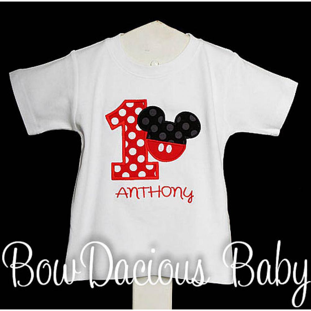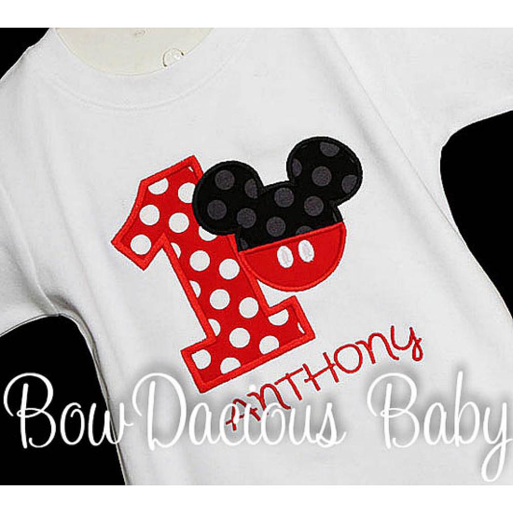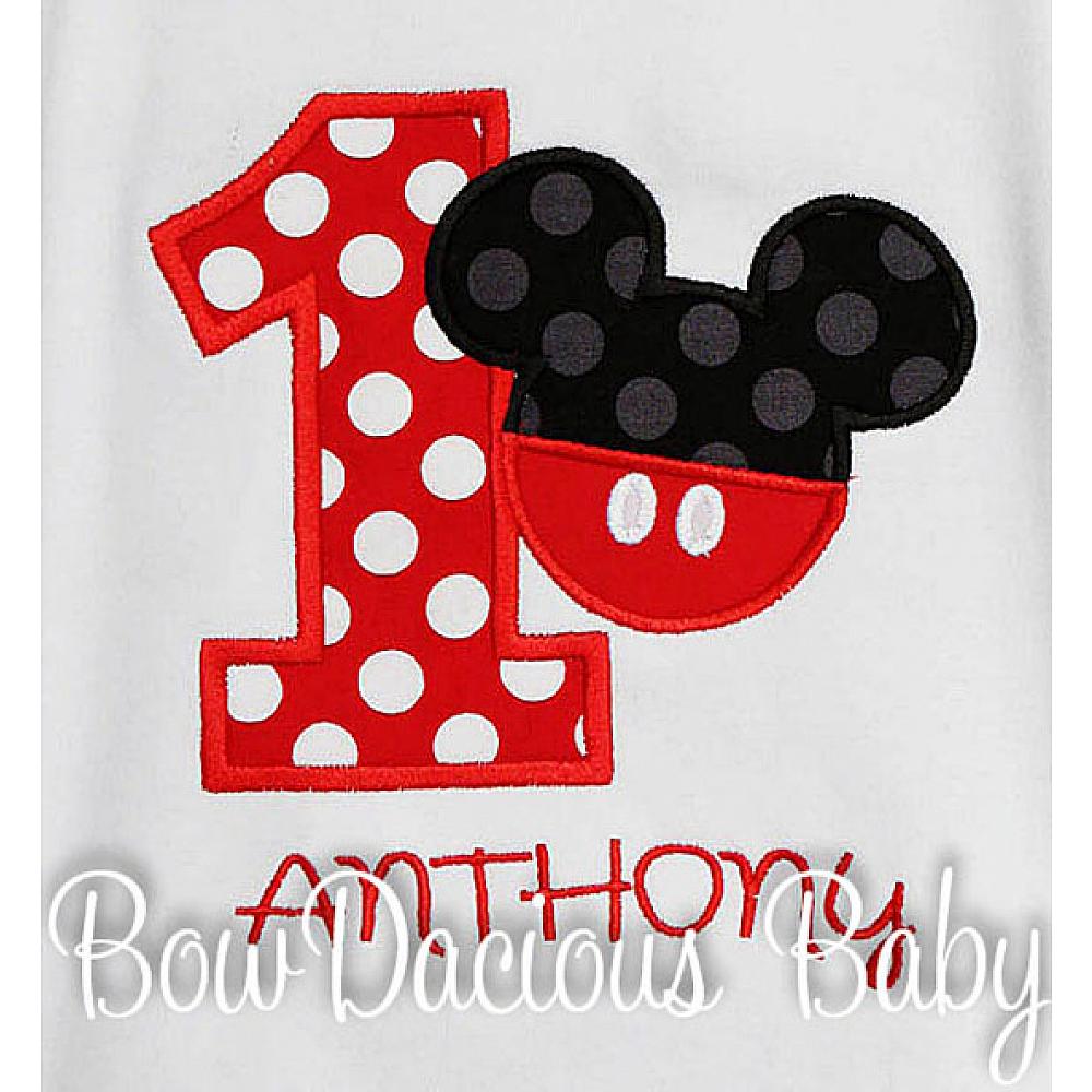 Personalized Mickey Mouse birthday shirt or onesie. Custom made to your specifications. You pick the fabric, font, and thread colors. Any Age. Add shorts, pants, a coordinating bib or diaper cover to complete the outfit.