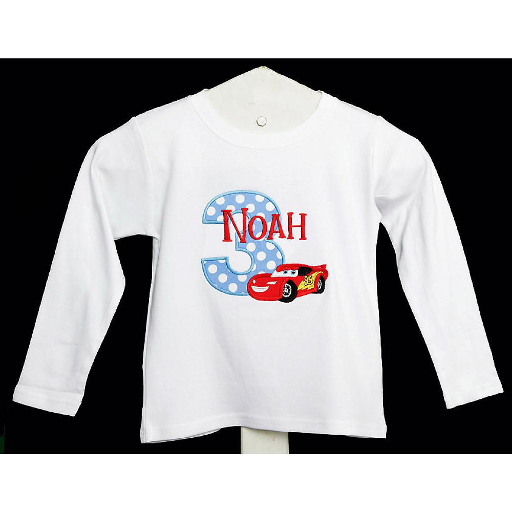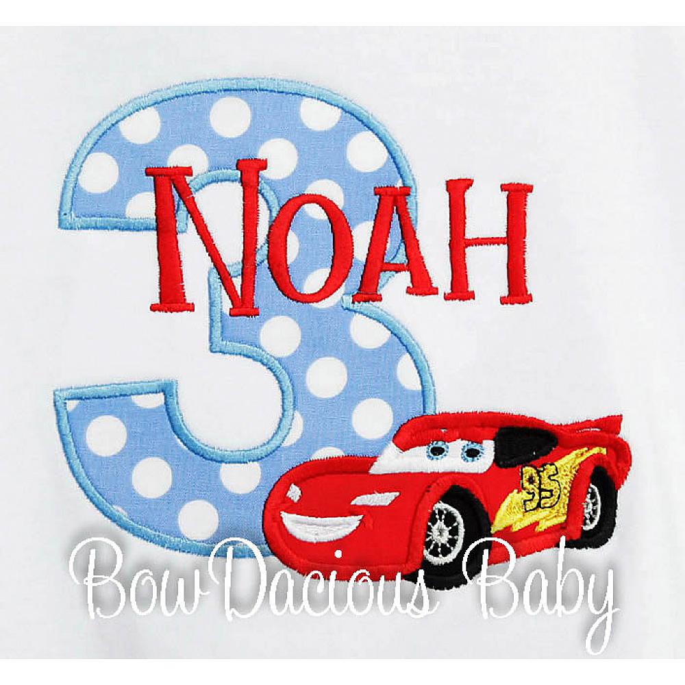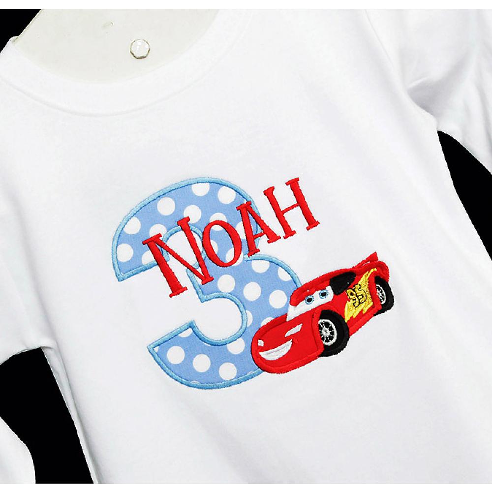 Disney Cars birthday number shirt or onesie. Custom made to your specifications. You pick the fabric, font, and thread colors. Any Age. Add shorts, pants, a coordinating bib or diaper cover to complete the outfit.
