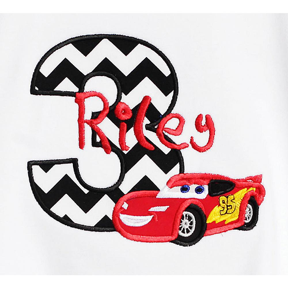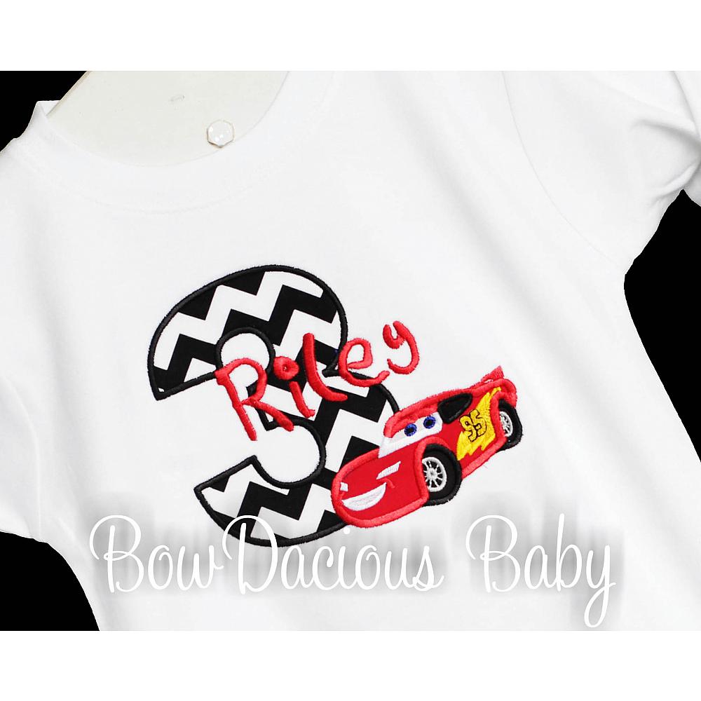 Disney Cars birthday number shirt or onesie. Custom made to your specifications. You pick the fabric, font, and thread colors. Any Age. Add shorts, pants, a coordinating bib or diaper cover to complete the outfit.