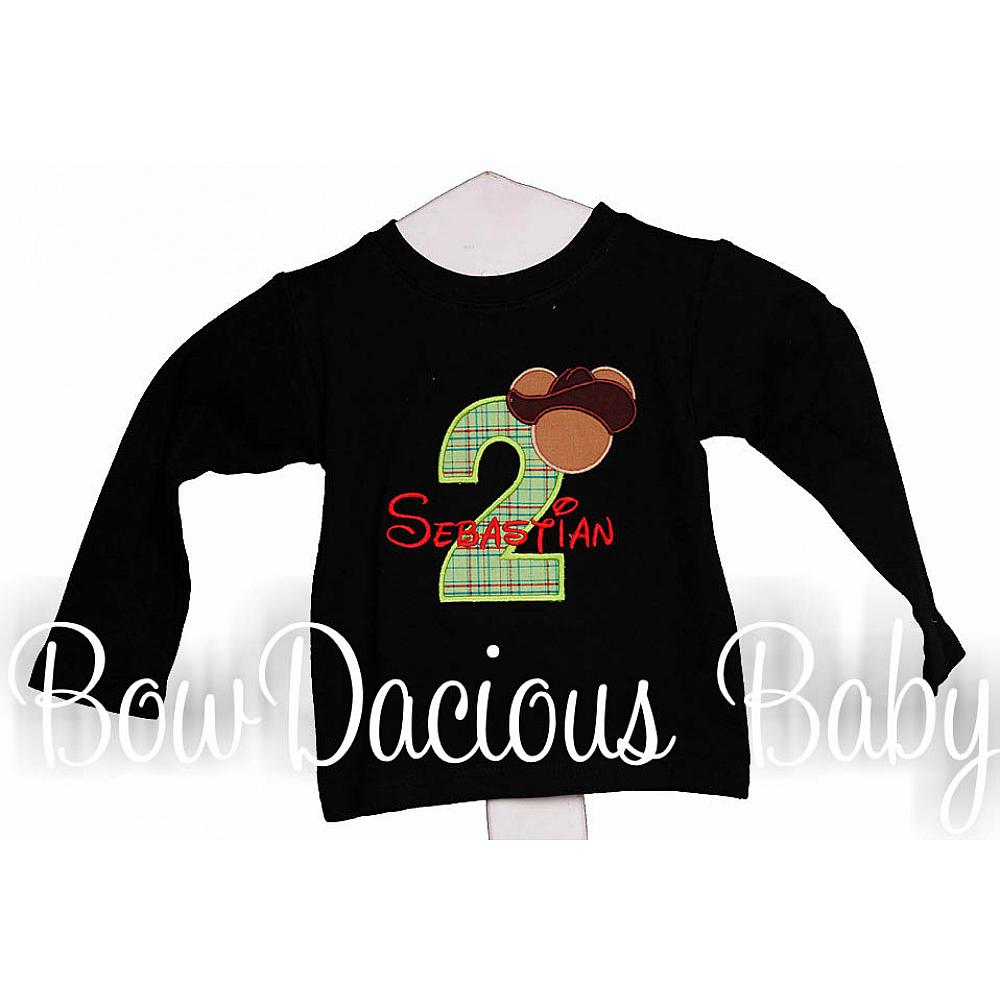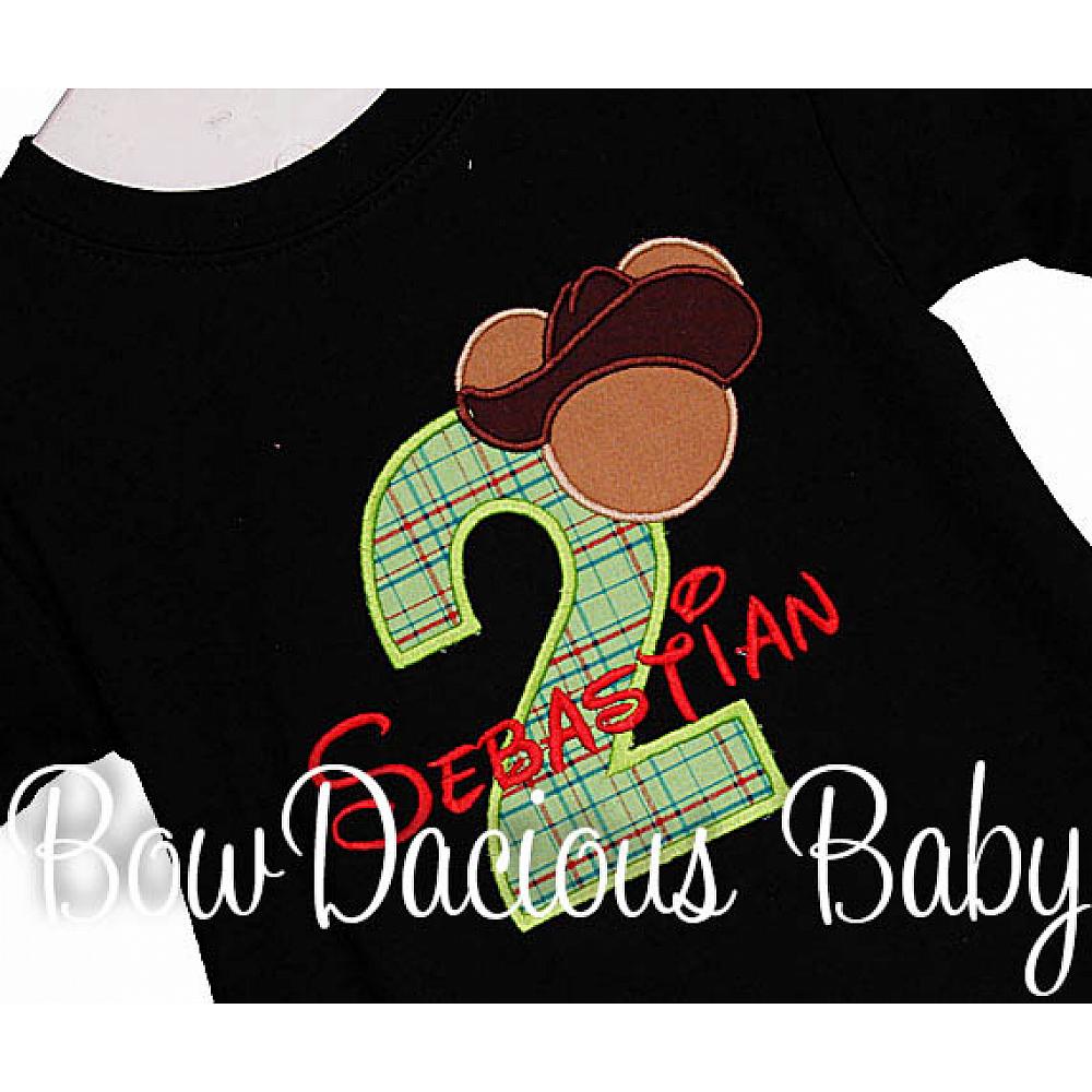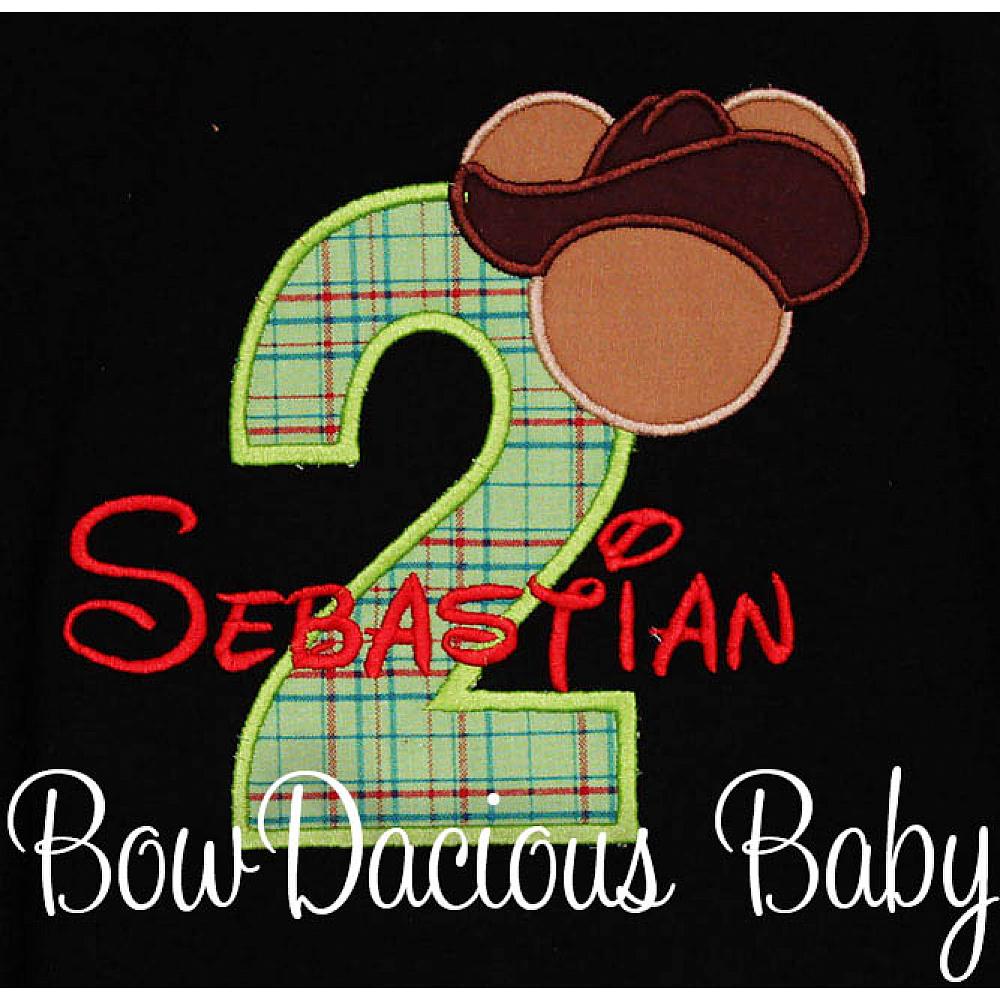 Cowboy Mickey Mouse birthday number shirt or onesie. Custom made to your specifications. You pick the fabric, font, and thread colors. Any Age. Add shorts, pants, a coordinating bib or diaper cover to complete the outfit.
