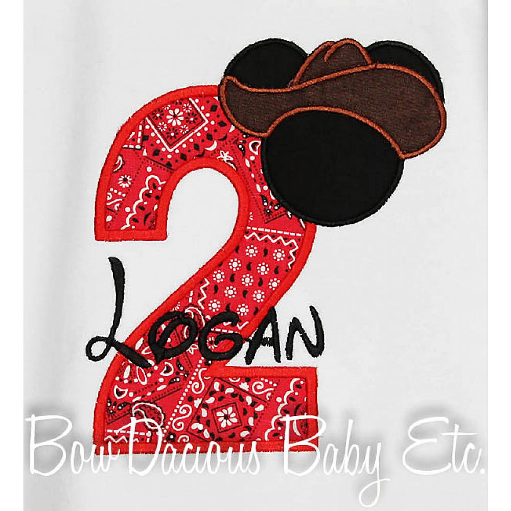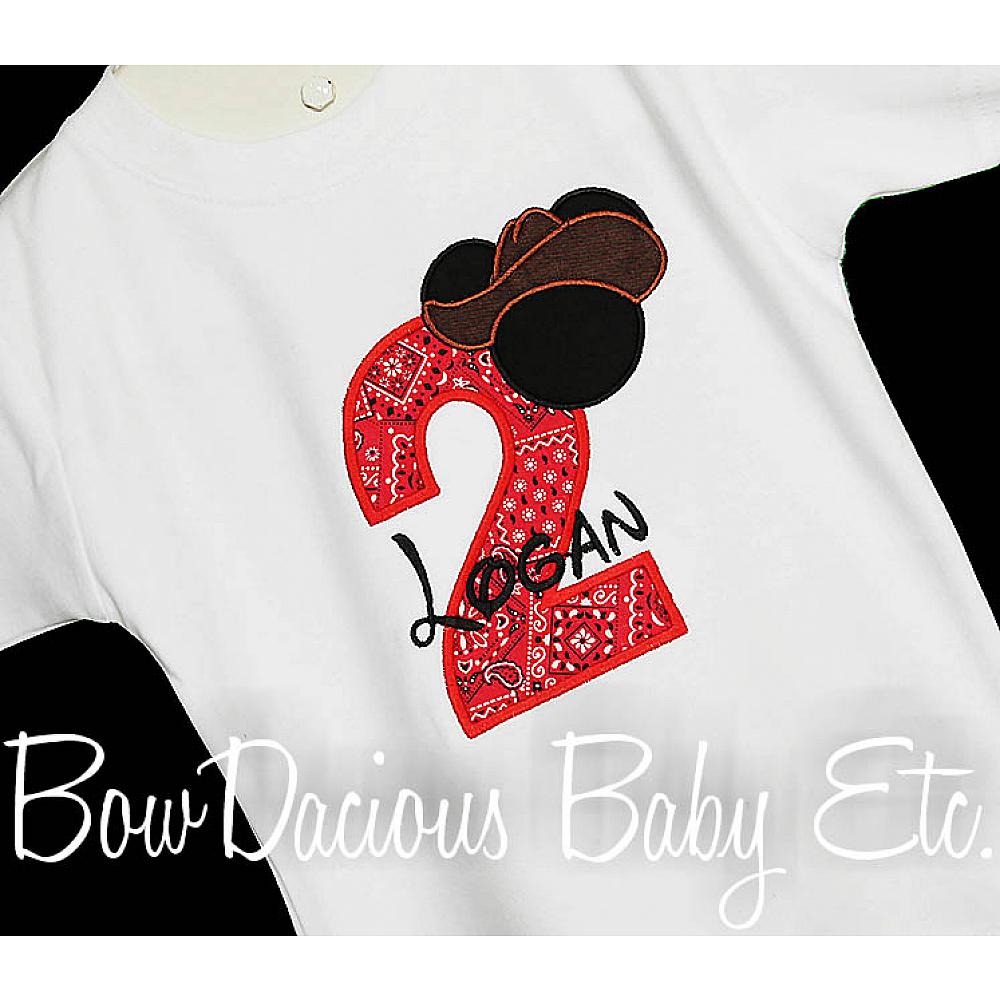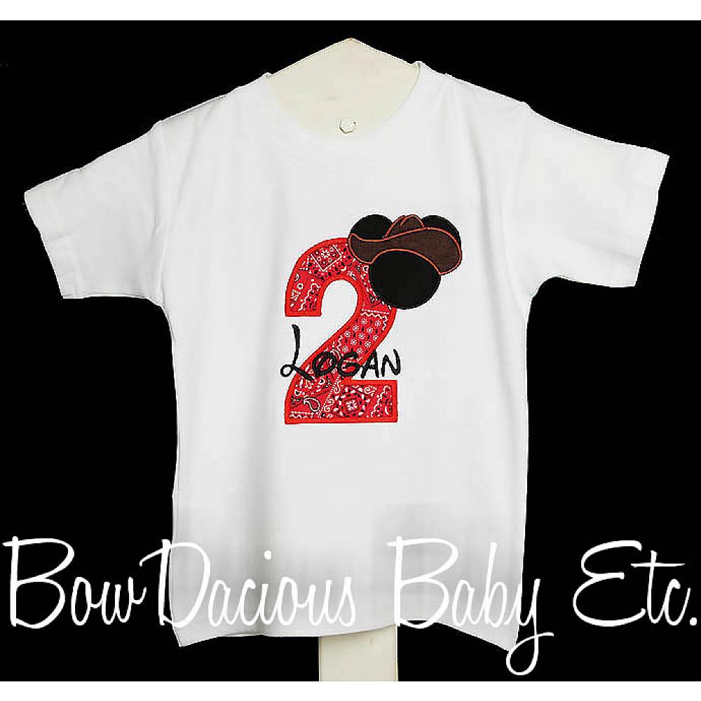 Cowboy Mickey Mouse birthday number shirt or onesie. Custom made to your specifications. You pick the fabric, font, and thread colors. Any Age. Add shorts, pants, a coordinating bib or diaper cover to complete the outfit.