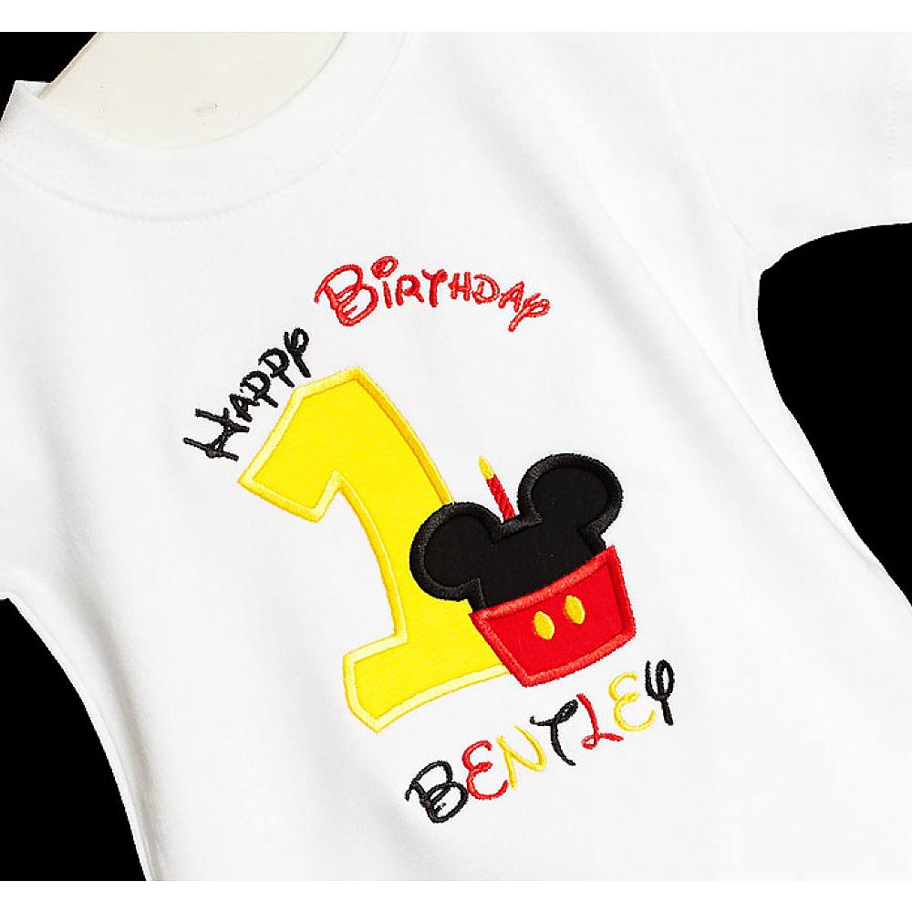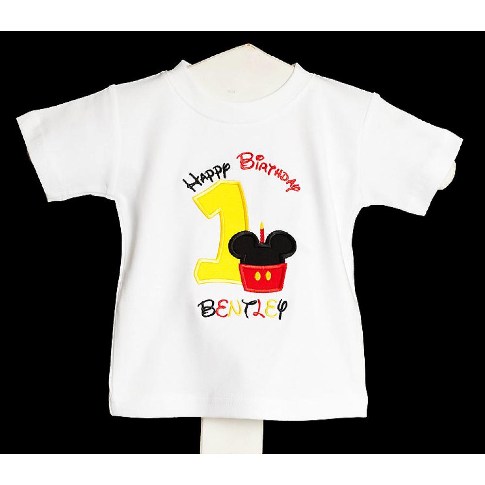 Cupcake Mickey Mouse birthday number shirt or onesie. Custom made to your specifications. You pick the fabric, font, and thread colors. Any Age. Add shorts, pants, a coordinating bib or diaper cover to complete the outfit.