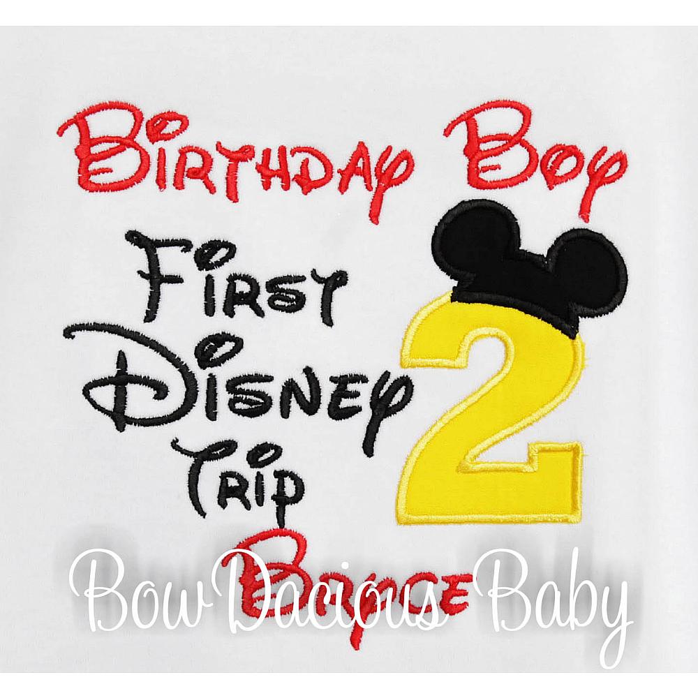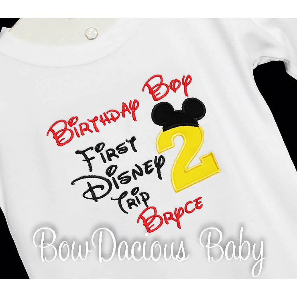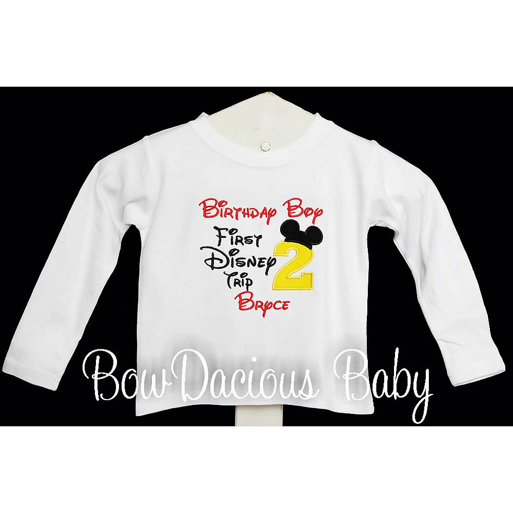 Personalized Birthday Boy, My First Disney Trip Shirt. Custom made to your specifications. You pick the fabric, font, and thread colors. Any Age. Add shorts, pants, a coordinating bib or diaper cover to complete the outfit.