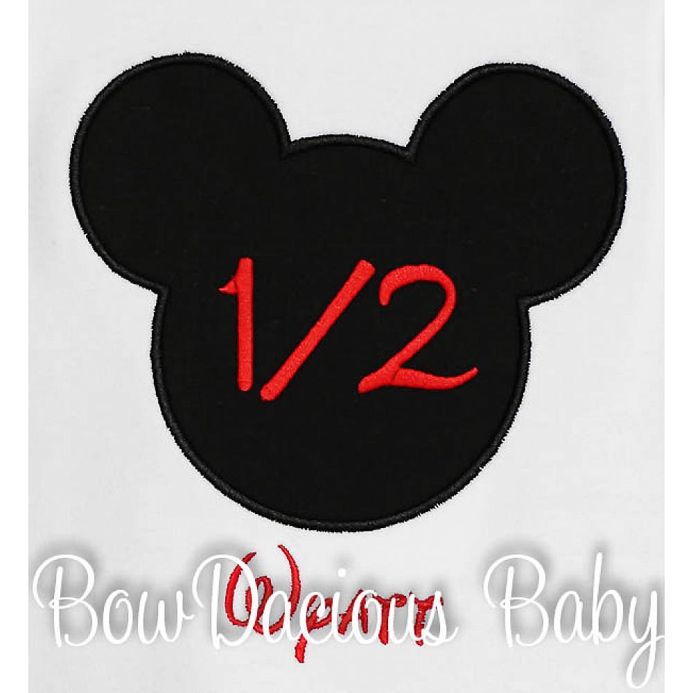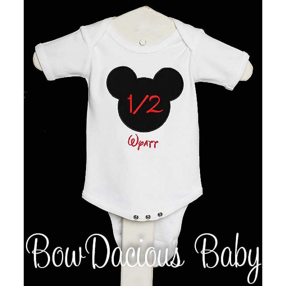 Personalized Half birthday Mickey Mouse shirt or onesie. Custom made to your specifications. You pick the fabric, font, and thread colors. Any Age. Add shorts, pants, a coordinating bib or diaper cover to complete the outfit.