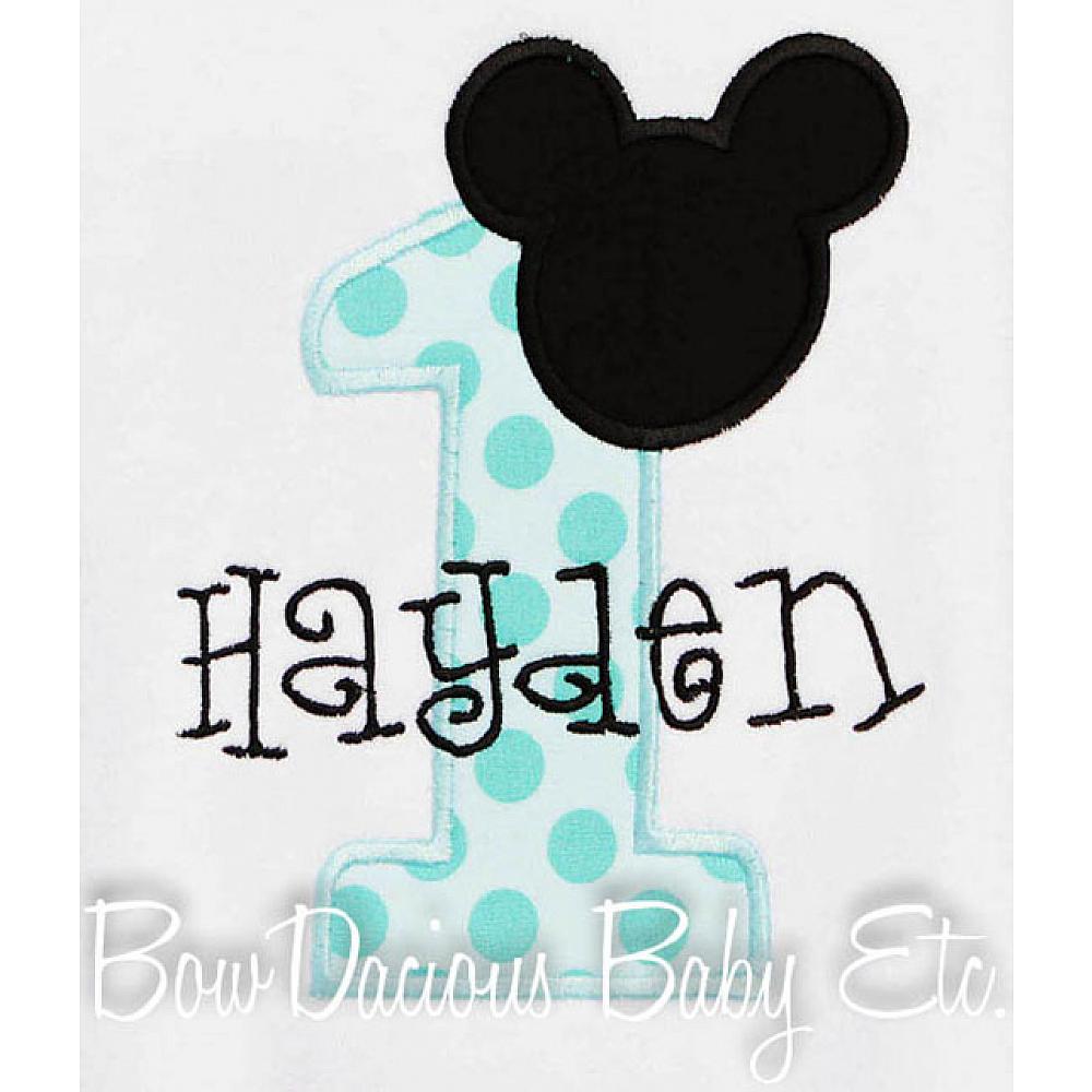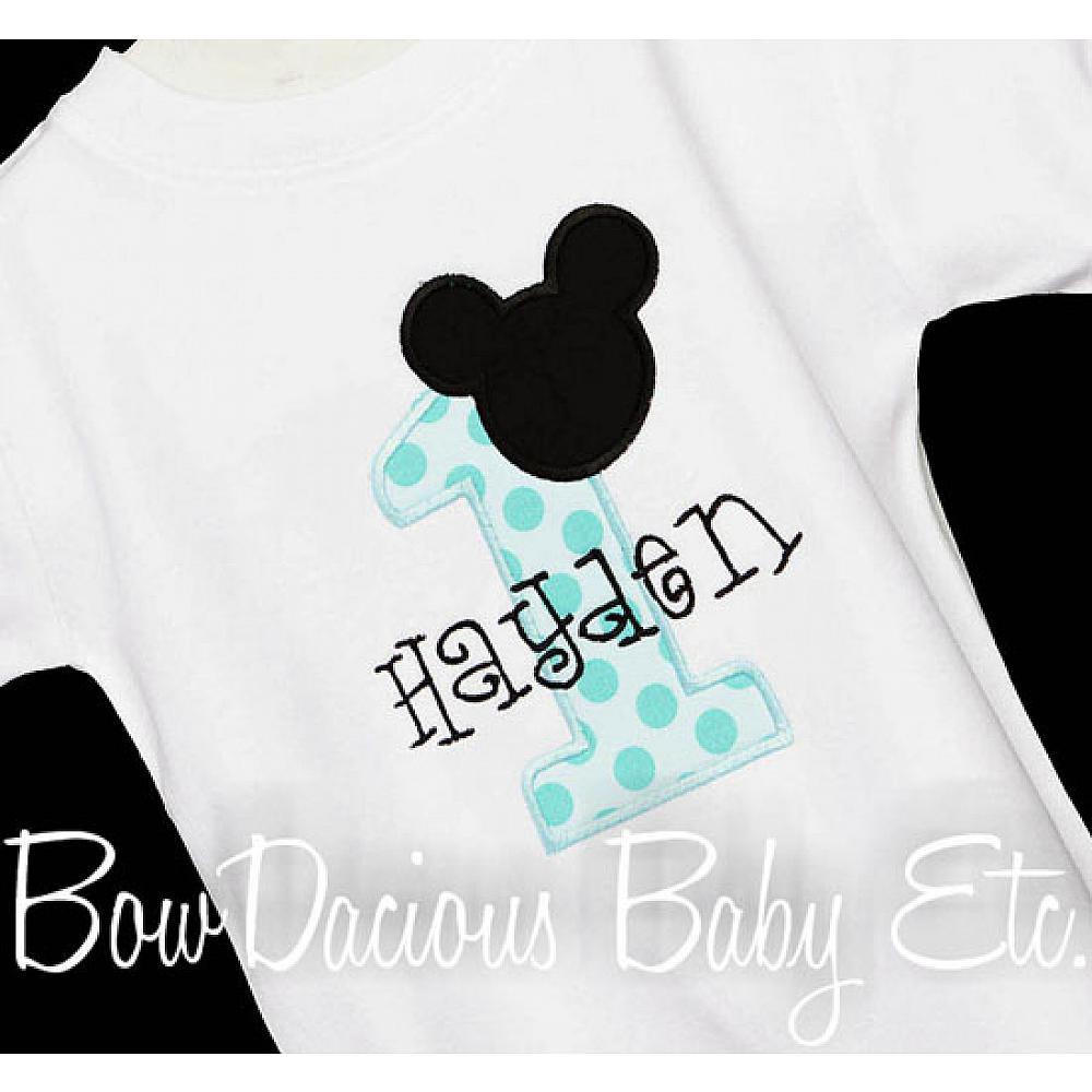 Personalized Mickey Mouse birthday shirt or onesie. Custom made to your specifications. You pick the fabric, font, and thread colors. Any Age. Add shorts, pants, a coordinating bib or diaper cover to complete the outfit.