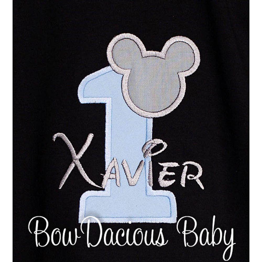 Personalized Mickey Mouse birthday shirt or onesie. Custom made to your specifications. You pick the fabric, font, and thread colors. Any Age. Add shorts, pants, a coordinating bib or diaper cover to complete the outfit.