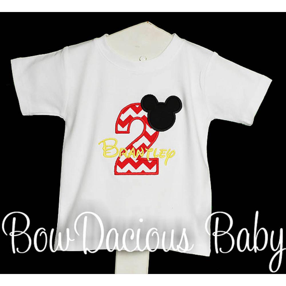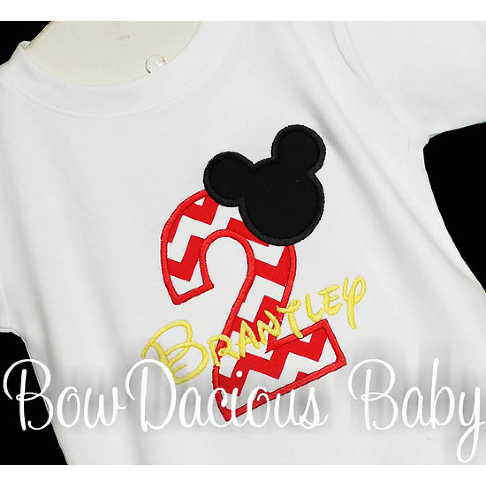 Personalized Mickey Mouse birthday shirt or onesie. Custom made to your specifications. You pick the fabric, font, and thread colors. Any Age. Add shorts, pants, a coordinating bib or diaper cover to complete the outfit.