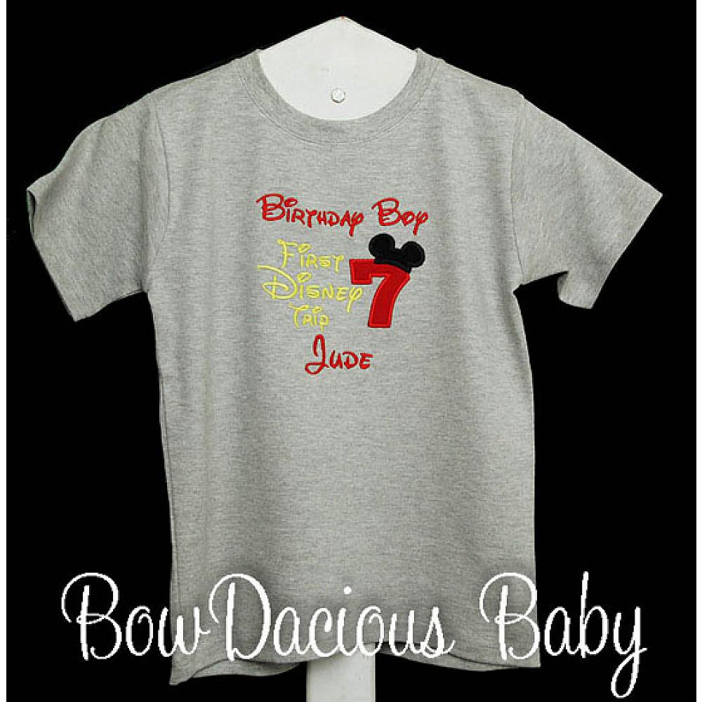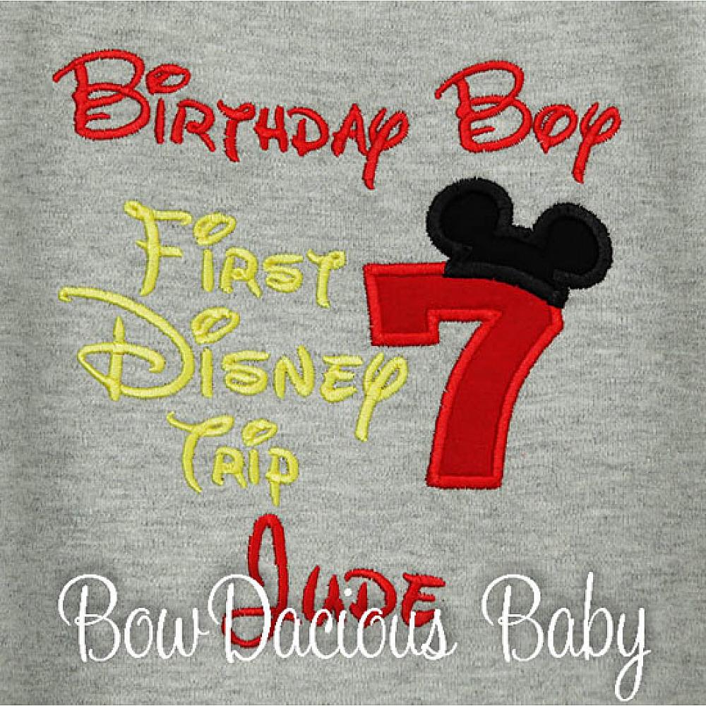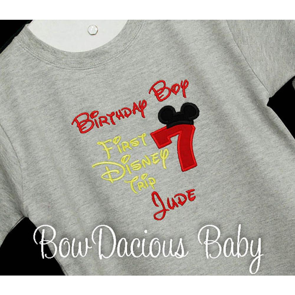 Personalized Birthday Boy, My First Disney Trip Shirt. Custom made to your specifications. You pick the fabric, font, and thread colors. Any Age. Add shorts, pants, a coordinating bib or diaper cover to complete the outfit.