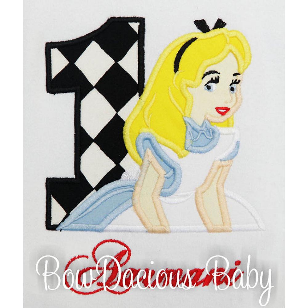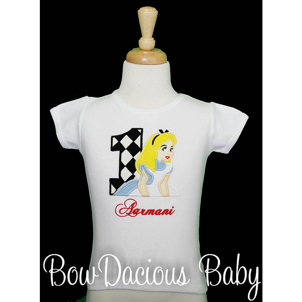 Personalized Alice in Wonderland birthday shirt or onesie. Custom made to your specifications. You pick the fabric, font, and thread colors. Add shorts, pants, a coordinating bib or diaper cover to complete the outfit.