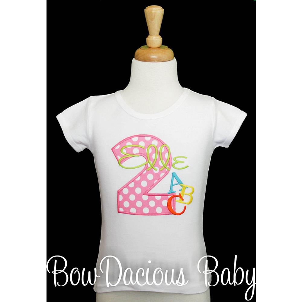 Personalized alphabet birthday shirt or onesie. Custom made to your specifications. You pick the fabric, font, and thread colors. Any Age. Add shorts, pants, a coordinating bib or diaper cover to complete the outfit.