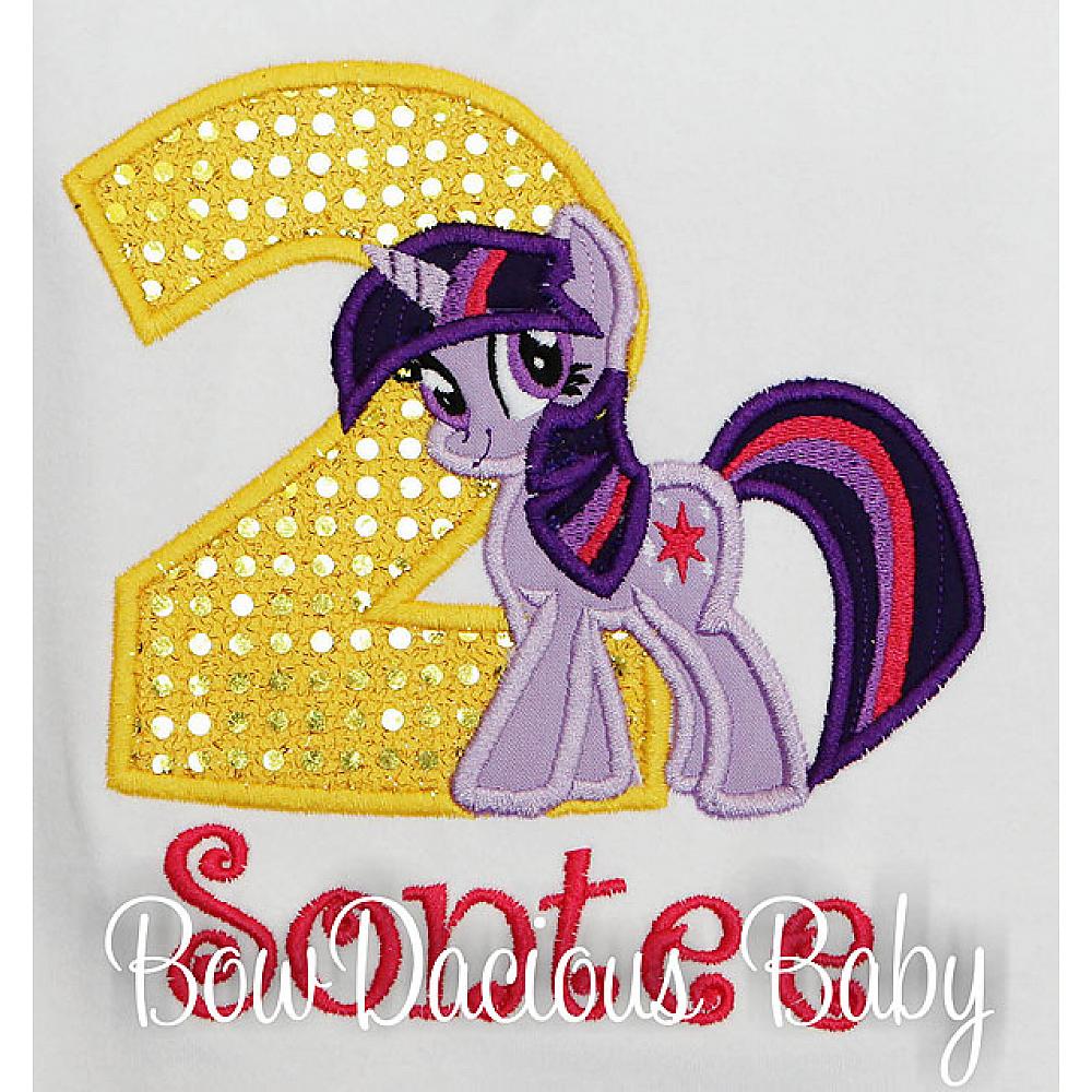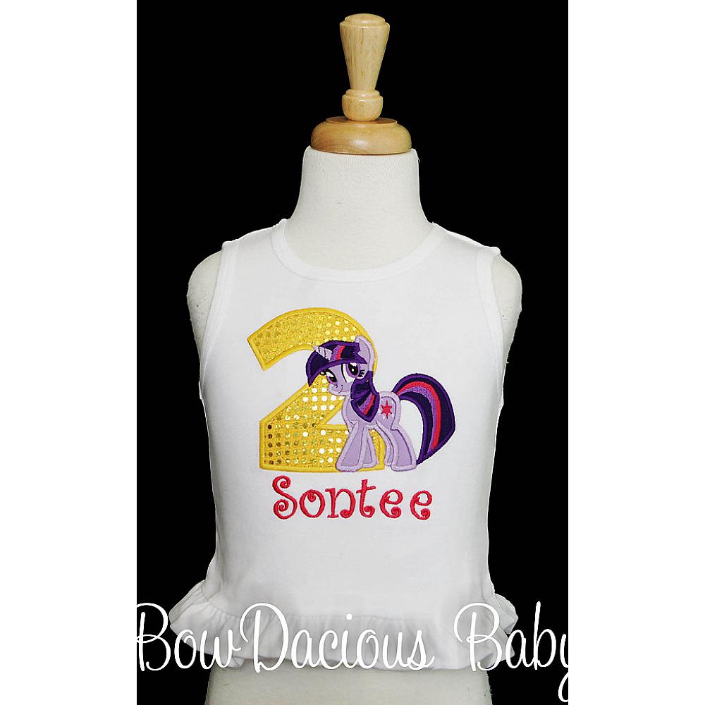 Personalized Twilight Sparkle birthday shirt or onesie. Custom made to your specifications. You pick the fabric, font, and thread colors. Any Age. Add shorts, pants, a coordinating bib or diaper cover to complete the outfit.