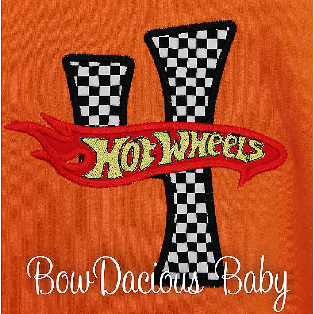 Personalized Hot Wheels birthday shirt or onesie. Custom made to your specifications. You pick the fabric, font, and thread colors. Add shorts, pants, a coordinating bib or diaper cover to complete the outfit.