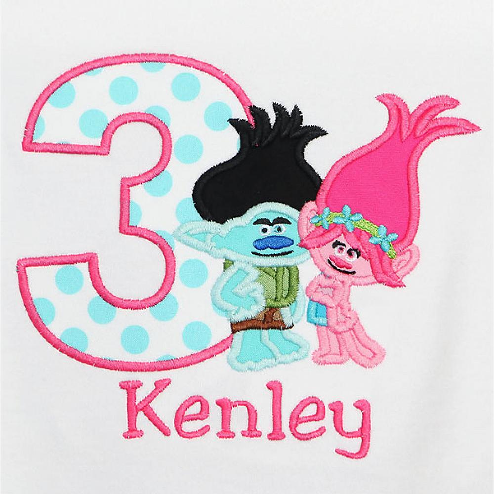 Personalized Trolls Poppy and Branch birthday shirt or onesie. Custom made to your specifications. You pick the fabric, font, and thread colors. Add shorts, pants, a coordinating bib or diaper cover to complete the outfit.