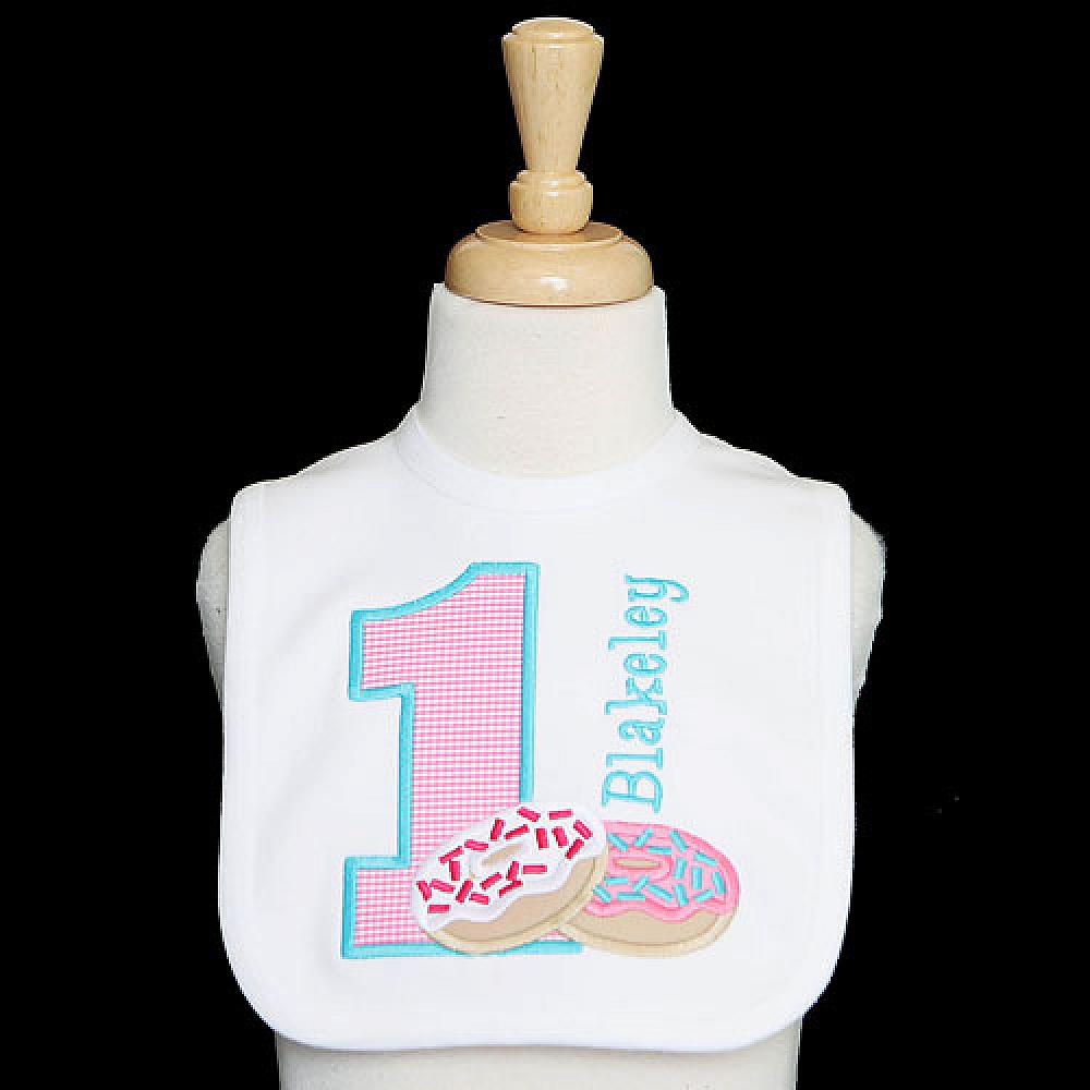 Personalized donut birthday bib. Custom made to your specifications. You pick the fabric, font, and thread colors. Add shorts, pants, a coordinating shirt or diaper cover to complete the outfit.