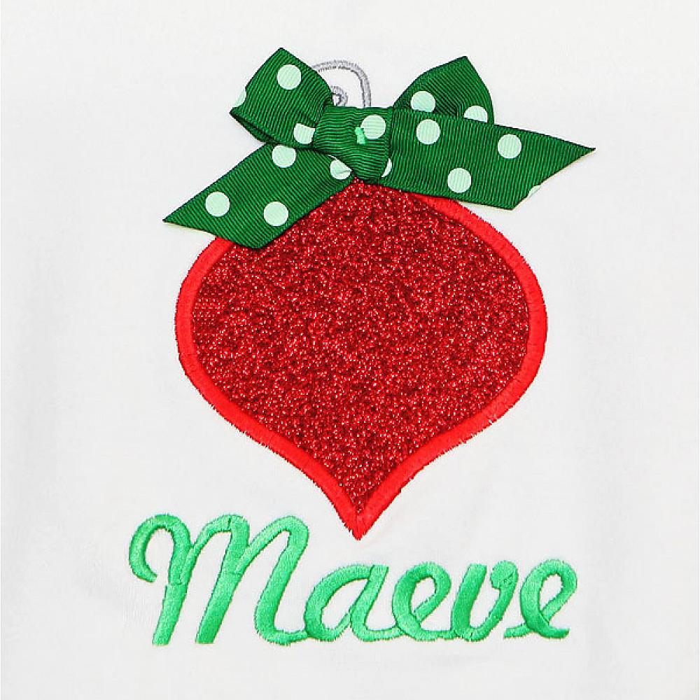Personalized glitter ornament Christmas shirt or onesie. Custom made to your specifications. You pick the fabric, font, and thread colors. Add shorts, pants, a coordinating bib or diaper cover to complete the outfit.