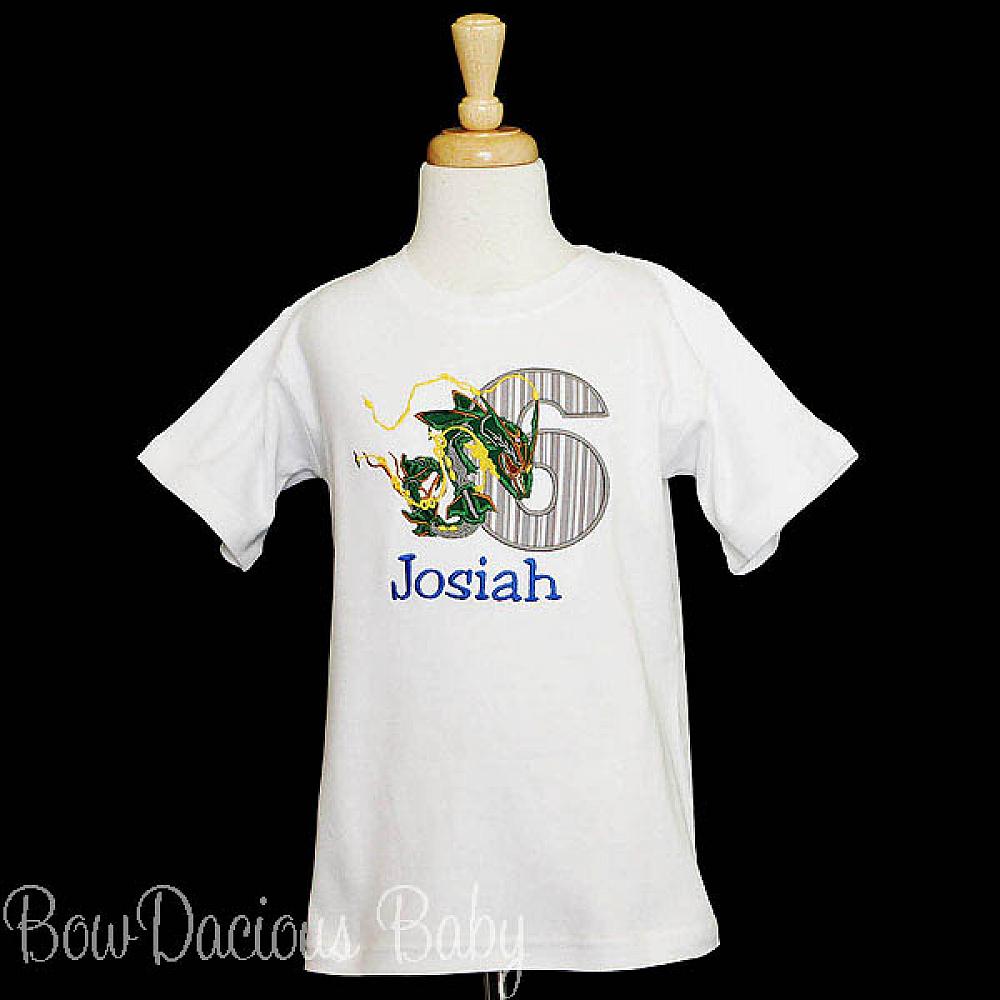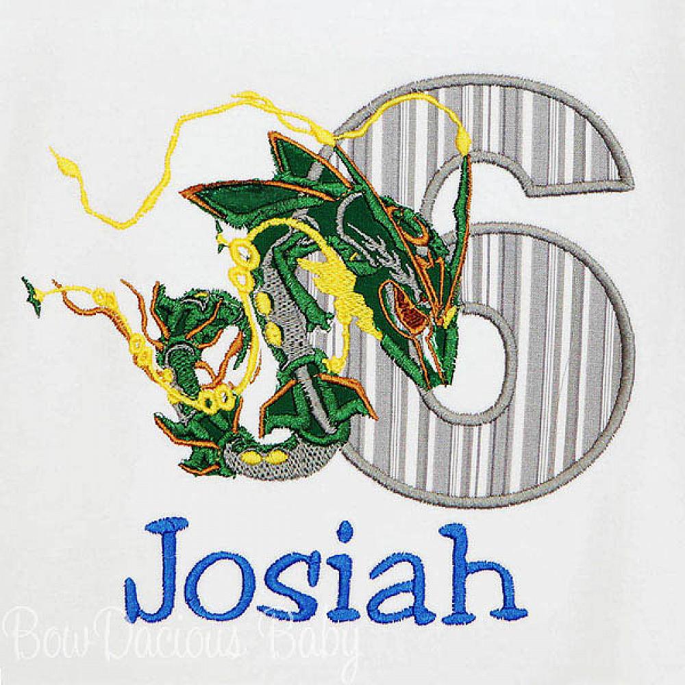 Personalized Pokemon Rayquaza birthday shirt or onesie. Custom made to your specifications. You pick the fabric, font, and thread colors. Add shorts, pants, a coordinating bib or diaper cover to complete the outfit.