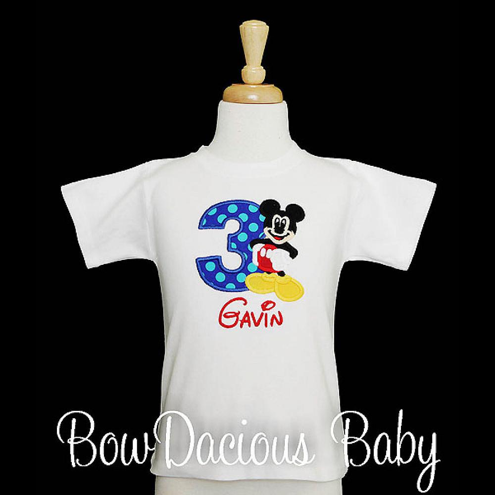 Personalized Mickey Mouse birthday shirt or onesie. Custom made to your specifications. You pick the fabric, font, and thread colors. Any Age. Add shorts, pants, a coordinating bib or diaper cover to complete the outfit.