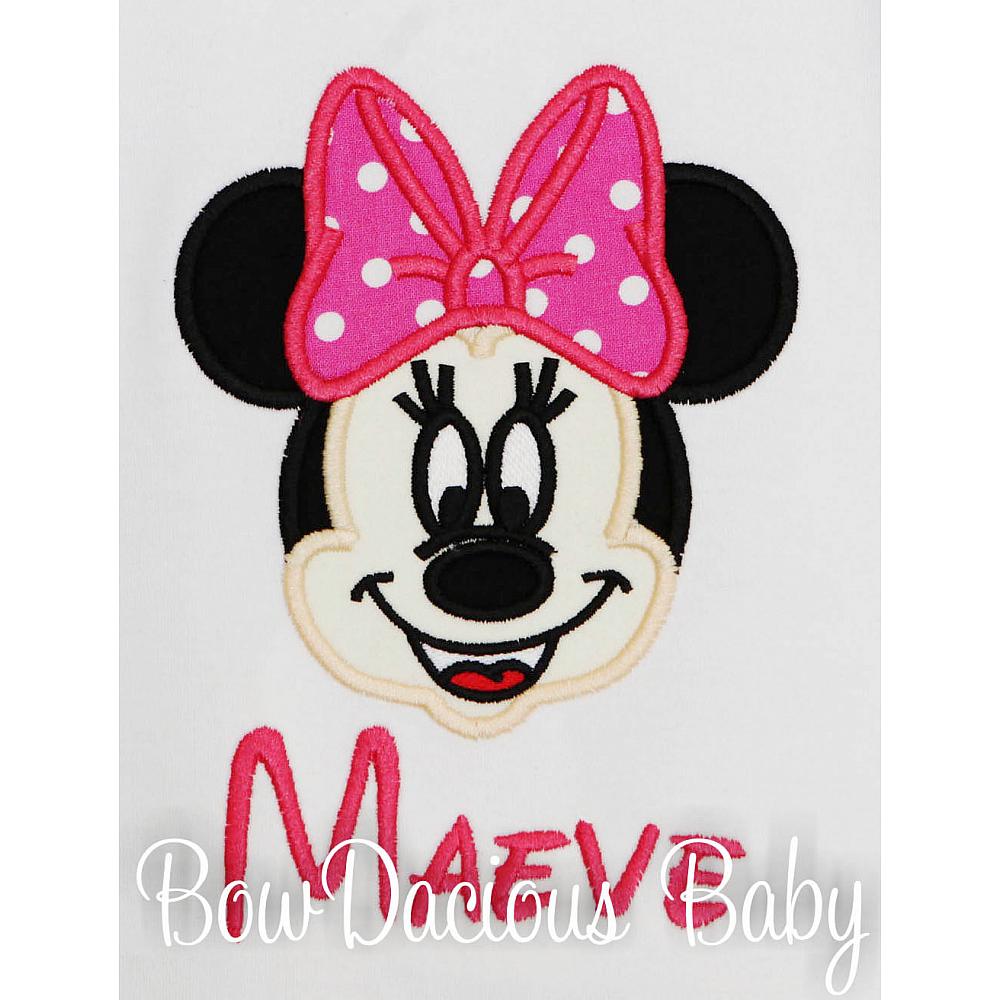 Personalized Minnie shirt or onesie. Custom made to your specifications. You pick the fabric, font, and thread colors. Any Age. Add shorts, pants, a coordinating bib or diaper cover to complete the outfit.