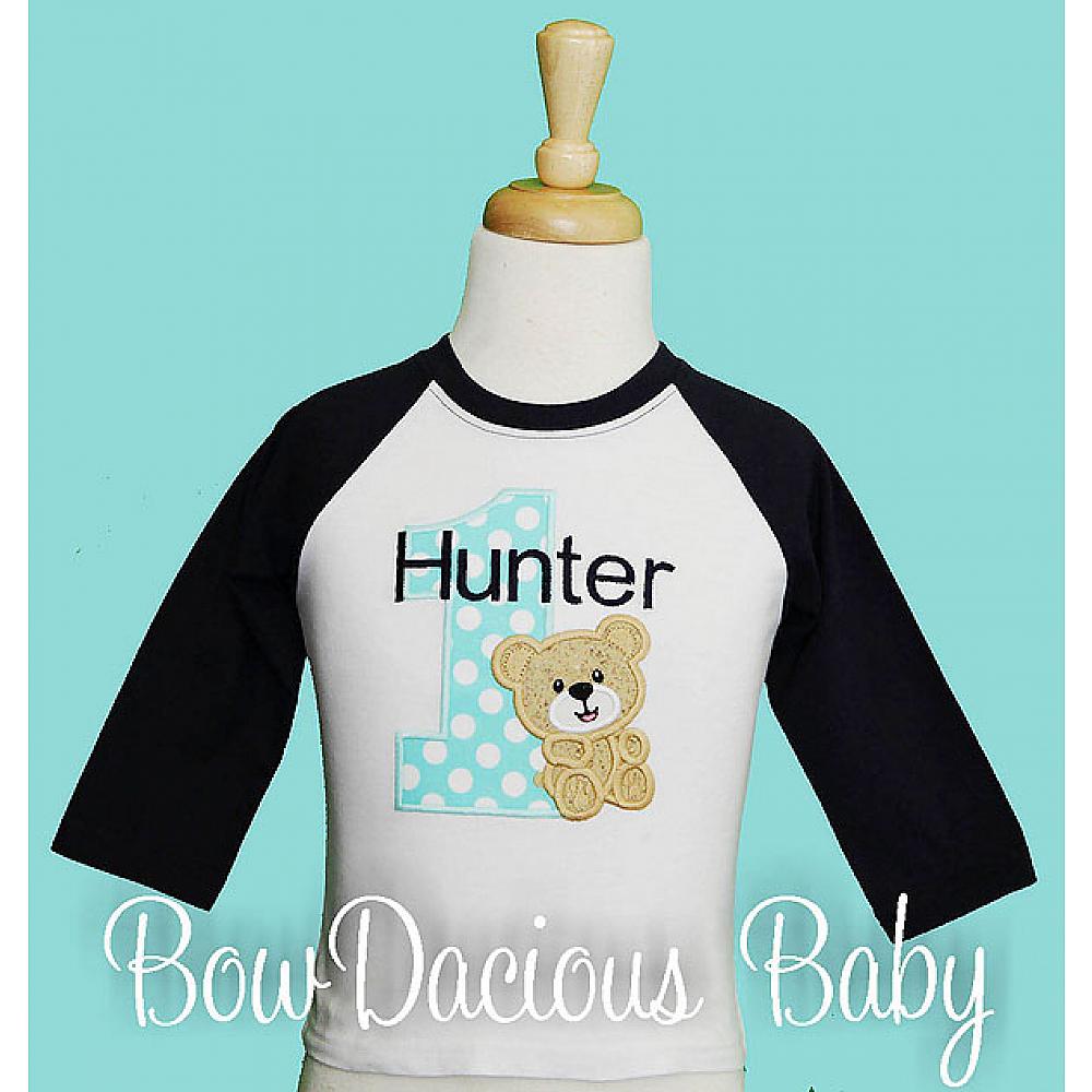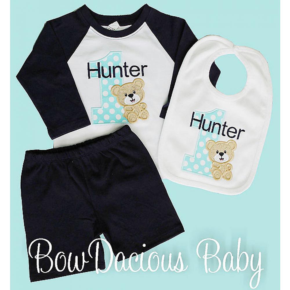 Personalized Teddy Bear birthday outfit. Custom made to your specifications. You pick the fabric, font, and thread colors. This item includes a shirt/onesie, bib, and shorts/pants.
