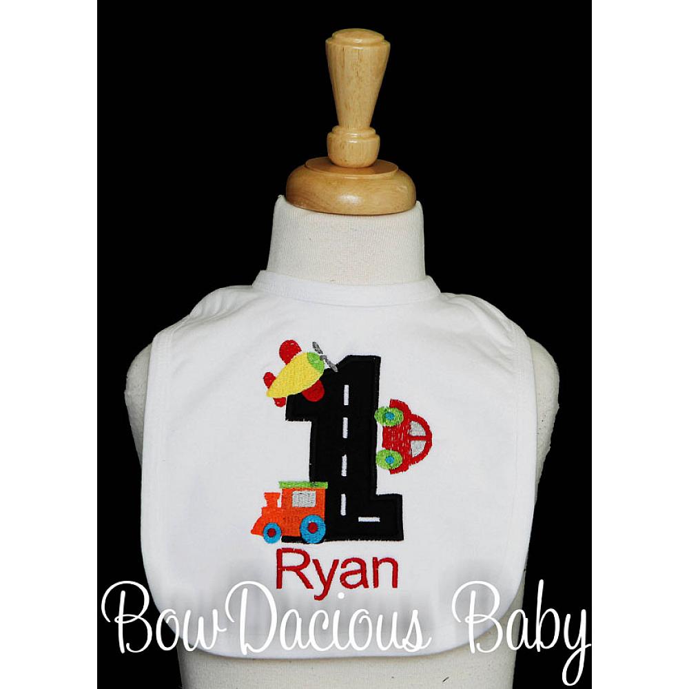 Personalized Transportation Vehicles birthday shirt or onesie and bib. Custom made to your specifications. You pick the fabric, font, and thread colors. Any Age. Add shorts, pants, or a coordinating diaper cover to complete the outfit.