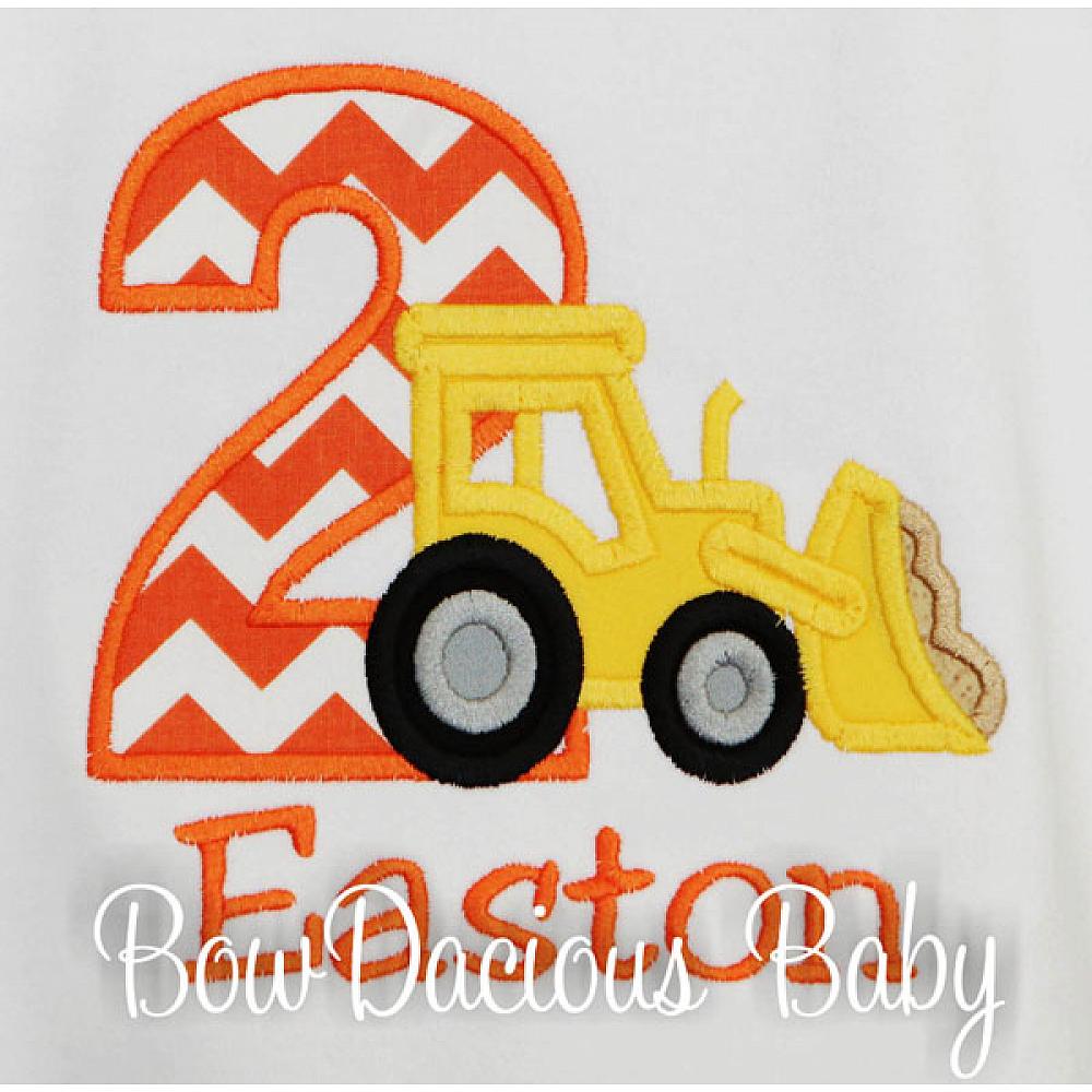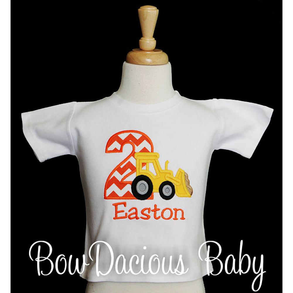 Personalized front end loader birthday shirt or onesie. Custom made to your specifications. You pick the fabric, font, and thread colors. Any Age. Add shorts, pants, a coordinating bib or diaper cover to complete the outfit.
