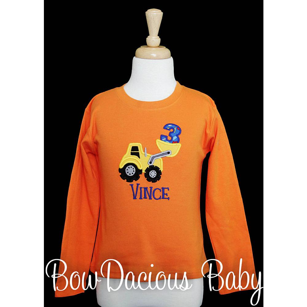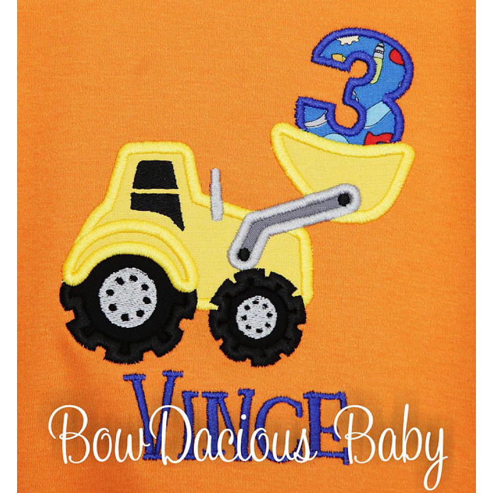 Personalized loader birthday shirt or onesie. Custom made to your specifications. You pick the fabric, font, and thread colors. Any Age. Add shorts, pants, a coordinating bib or diaper cover to complete the outfit.