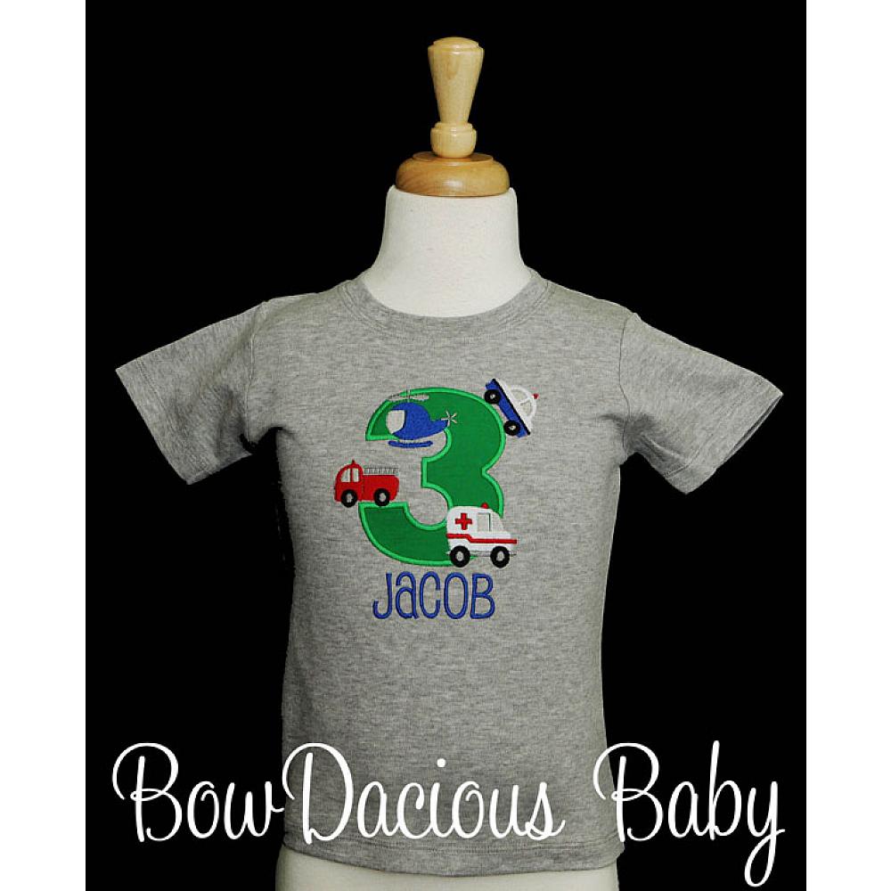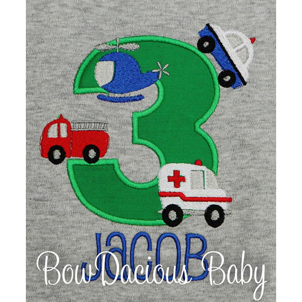 Personalized emergency responders birthday shirt or onesie. Custom made to your specifications. You pick the fabric, font, and thread colors. Any Age. Add shorts, pants, a coordinating bib or diaper cover to complete the outfit.