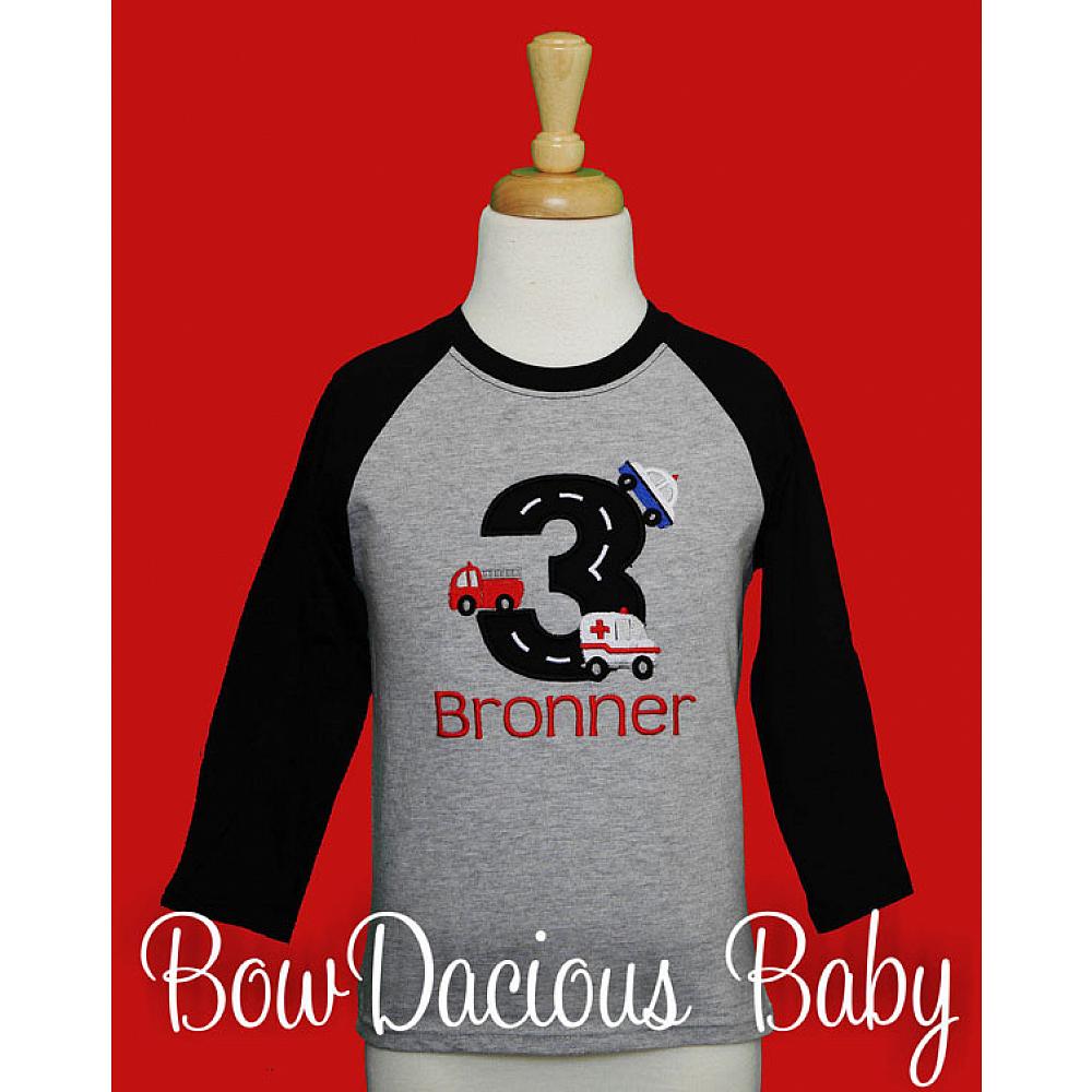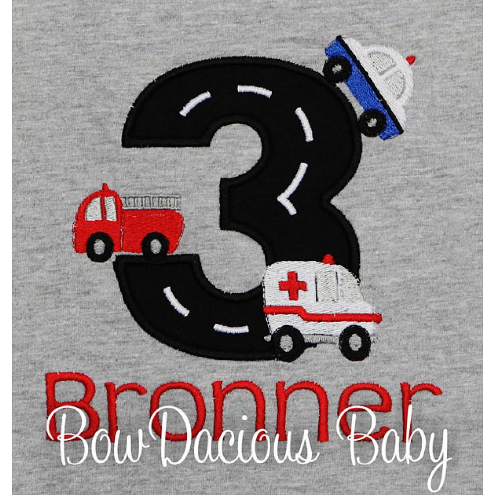 Personalized Rescue Vehicles birthday shirt or onesie. Custom made to your specifications. You pick the fabric, font, and thread colors. Add shorts, pants, a coordinating bib or diaper cover to complete the outfit.