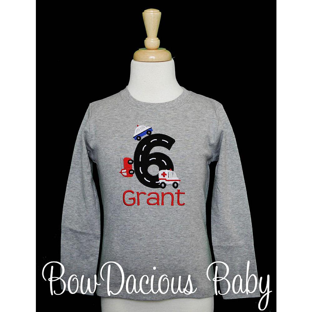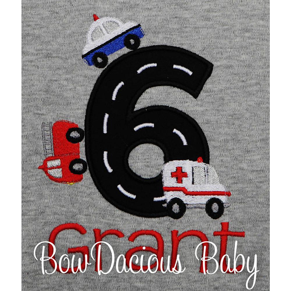 Personalized emergency responders birthday shirt or onesie. Custom made to your specifications. You pick the fabric, font, and thread colors. Any Age. Add shorts, pants, a coordinating bib or diaper cover to complete the outfit.