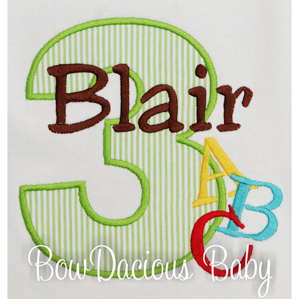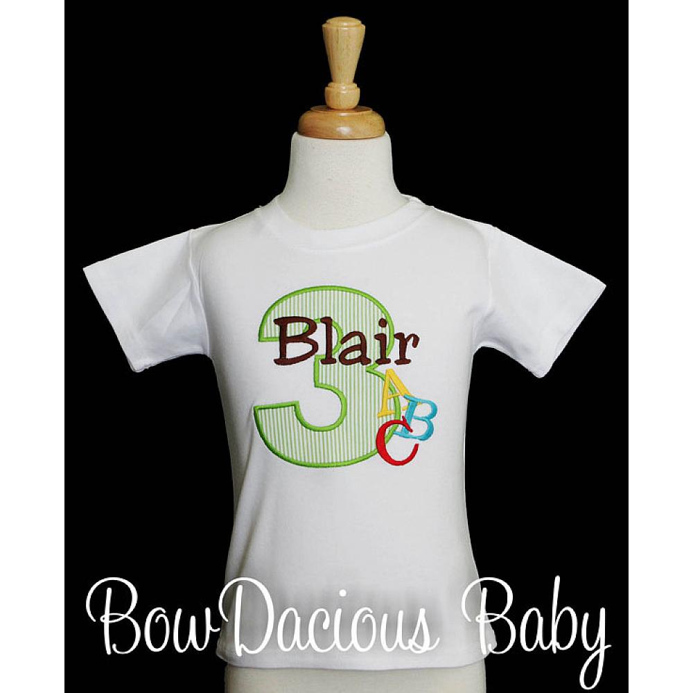 Personalized alphabet birthday shirt or onesie. Custom made to your specifications. You pick the fabric, font, and thread colors. Any Age. Add shorts, pants, a coordinating bib or diaper cover to complete the outfit.