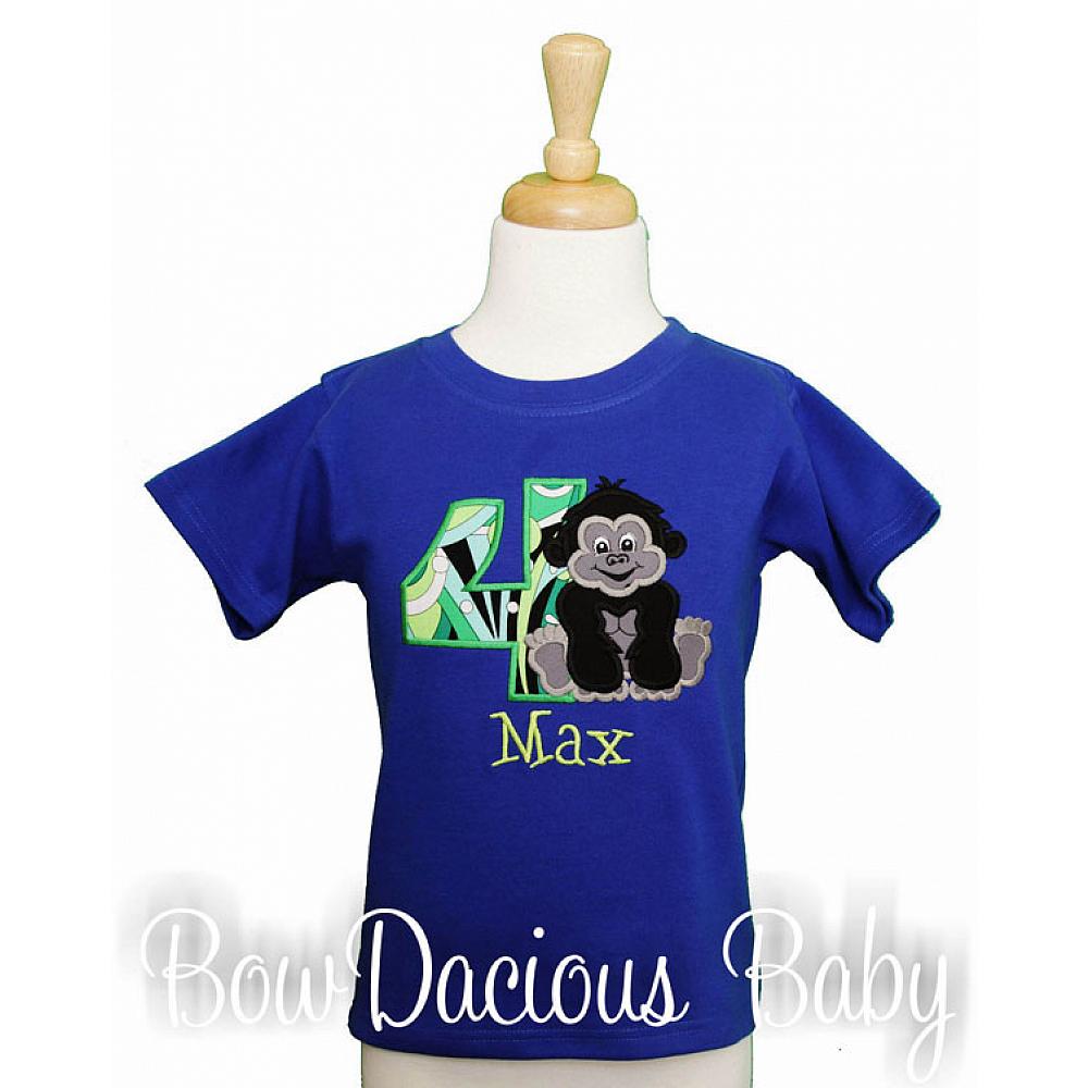 Personalized gorilla birthday shirt or onesie. Custom made to your specifications. You pick the fabric, font, and thread colors. Any Age. Add shorts, pants, a coordinating bib or diaper cover to complete the outfit.