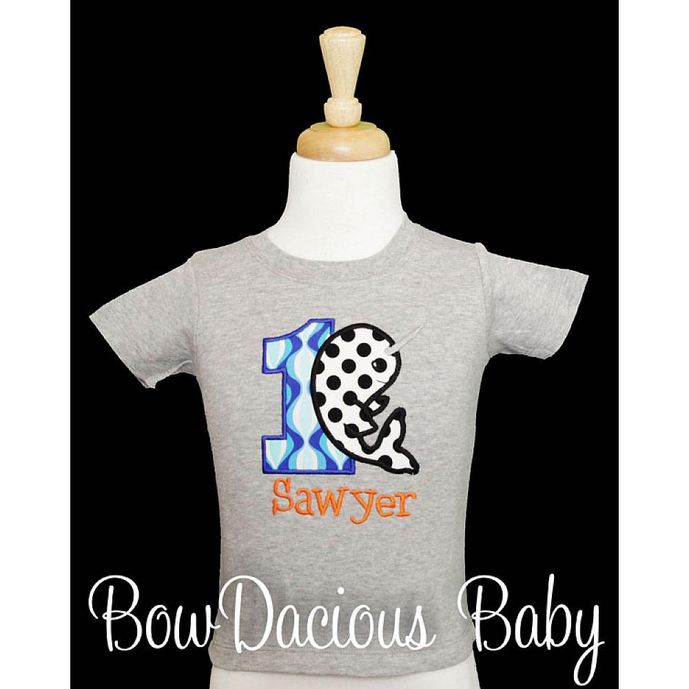 Personalized narwhal birthday shirt or onesie. Custom made to your specifications. You pick the fabric, font, and thread colors. Any Age. Add shorts, pants, a coordinating bib or diaper cover to complete the outfit.