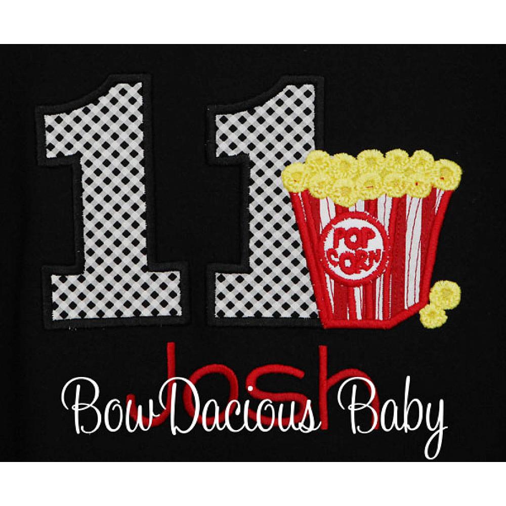 Personalized popcorn birthday shirt or onesie. Custom made to your specifications. You pick the fabric, font, and thread colors. Add shorts, pants, a coordinating bib or diaper cover to complete the outfit.
