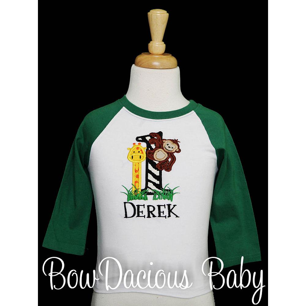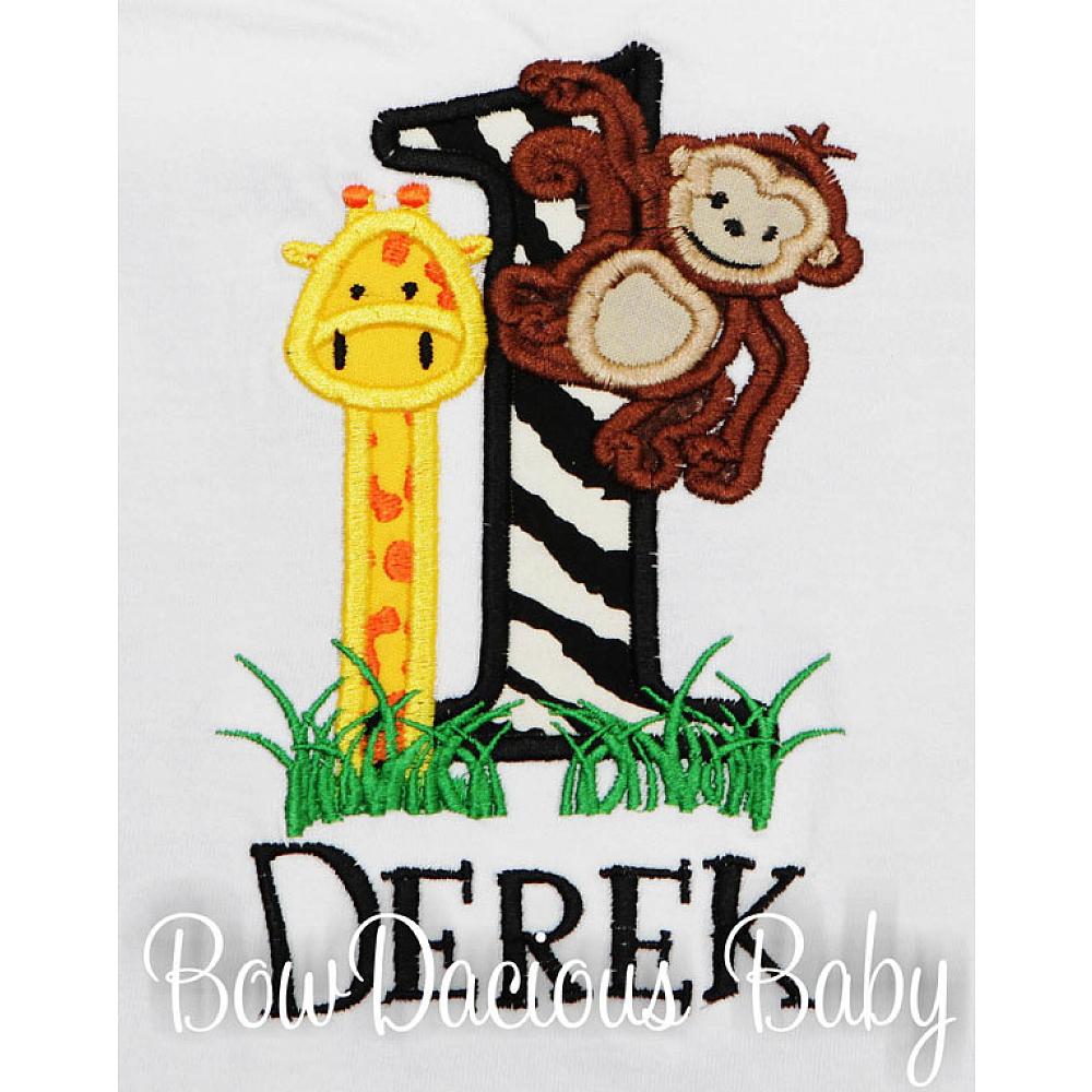Personalized jungle birthday shirt or onesie. Custom made to your specifications. You pick the fabric, font, and thread colors. Add shorts, pants, a coordinating bib or diaper cover to complete the outfit.