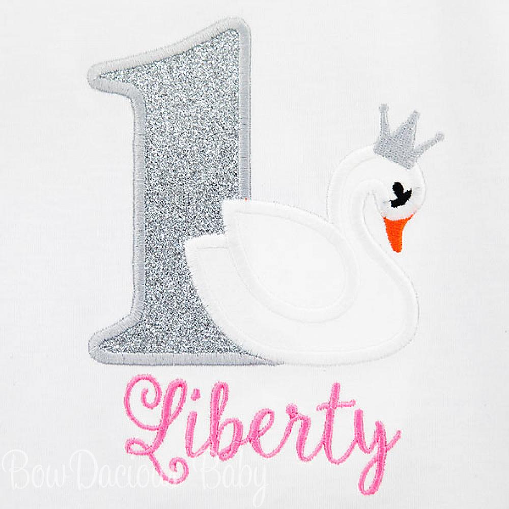 Personalized Swan birthday shirt or onesie. Custom made to your specifications. You pick the fabric, font, and thread colors. Any Age. Add shorts, pants, a coordinating bib or diaper cover to complete the outfit.
