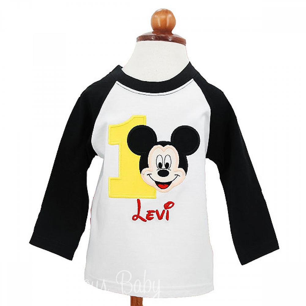 Personalized Mickey face birthday shirt or onesie. Custom made to your specifications. You pick the fabric, font, and thread colors. Add shorts, pants, a coordinating bib or diaper cover to complete the outfit.