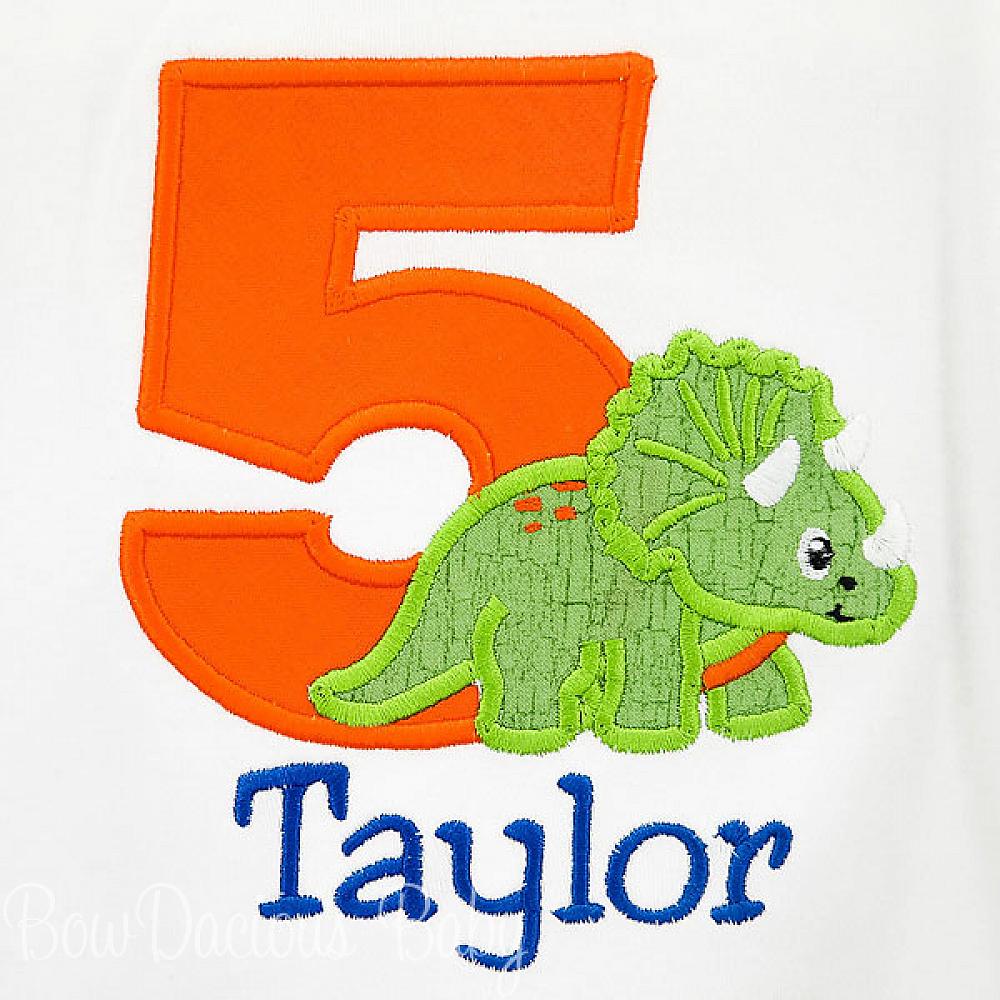 Personalized triceratops birthday shirt or onesie. Custom made to your specifications. You pick the fabric, font, and thread colors. Add shorts, pants, a coordinating bib or diaper cover to complete the outfit.