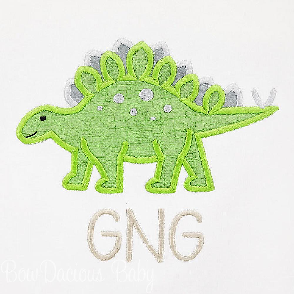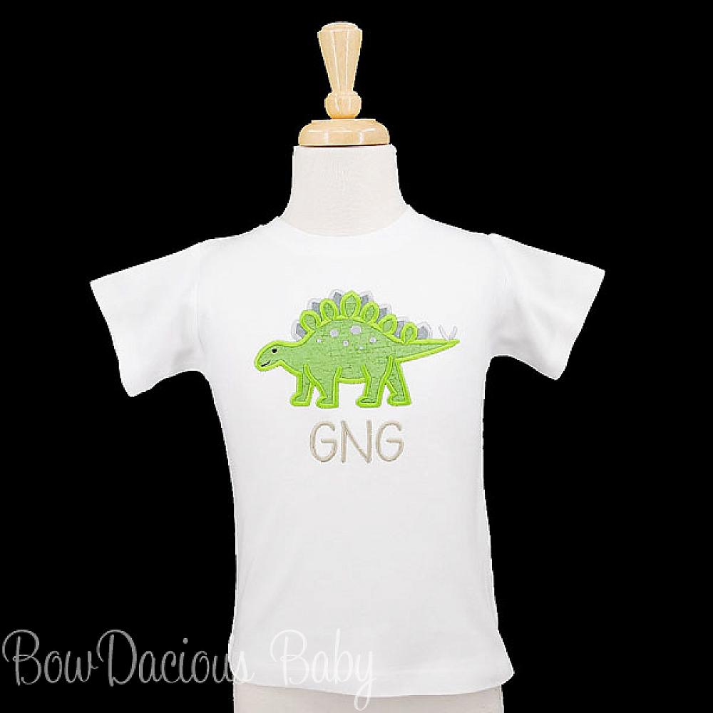 Custom monogrammed stegosaurus shirt or onesie. Custom made to your specifications. You pick the fabric, font, and thread colors. Add shorts, pants, a coordinating bib or diaper cover to complete the outfit.