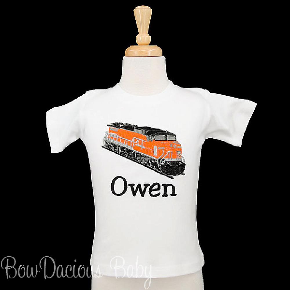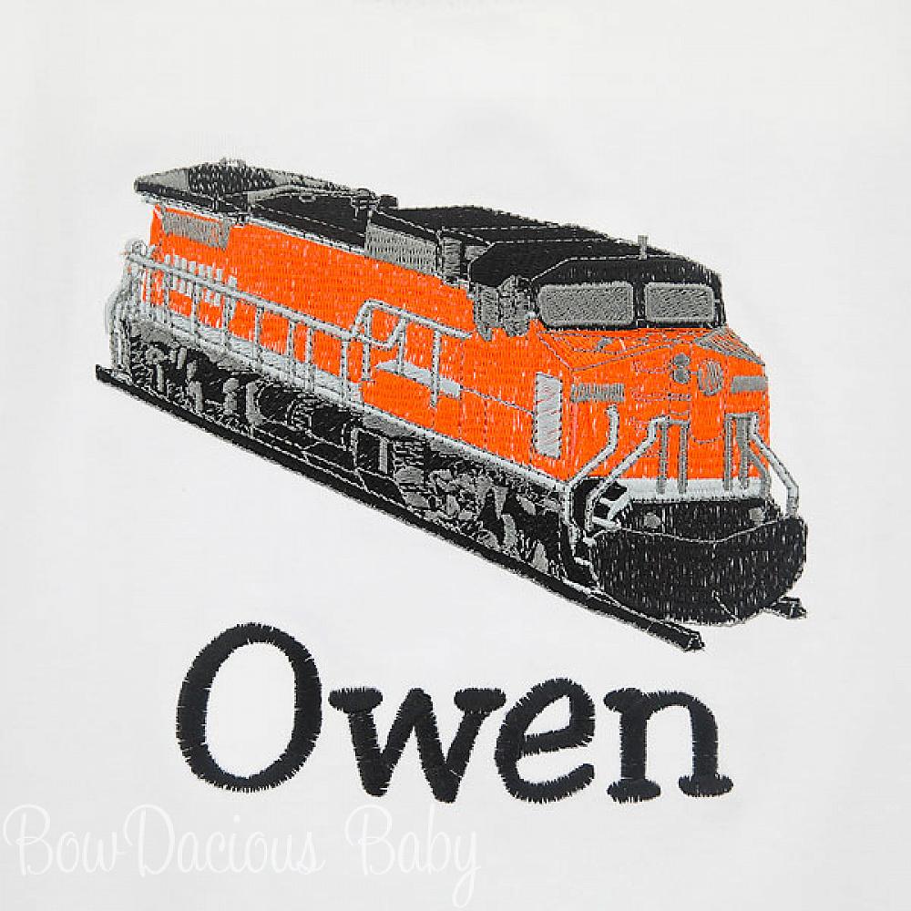 Custom monogrammed train shirt or onesie. Custom made to your specifications. You pick the fabric, font, and thread colors. Add shorts, pants, a coordinating bib or diaper cover to complete the outfit.
